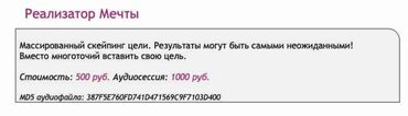 2. Составляете список целевых скейпов - желаемых образов или установок, загружаемых по вашей воле в ваше подсознание. Затем дописываете к ним любые образы, которые так или иначе уточняют и детализируют те вещи и обстоятельства, которые вы хотите иметь в своей жизни. Изначально вместе со списком иллюзий планировалось предоставлять клиенту также и список целевых скейпов. Однако образы желаний и конечной цели для каждого отдельно взятого человека будут индивидуальны и совершенно уникальны. Поэтому список целевых скейпов вам придется соствлять самостоятельно (за исключением случаев, когда вы используете в качестве дополнения аудиосессию, в которую уже загружены базовые, наиболее популярные целевые скейпь). Однако спешим заметить, что этот этап проработки самый приятный. Кроме того, «позитивные» или просто положительные эффективные скейпы придумывать очень легко, отталкиваясь от иллюзий из нашего списка, как от обратного!