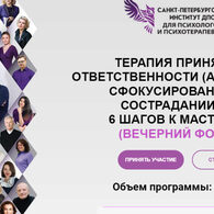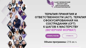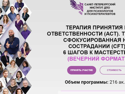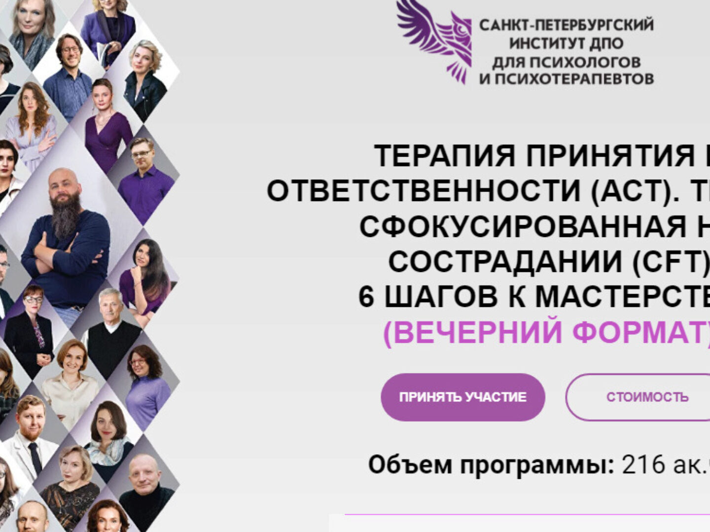 1 вариант ACT тревожных расстройств и депрессии + CFT 36 ак. часов. На нашем цикле вы: познакомитесь с терапией, сфокусированной на сострадании (CFT, от англ. сompassion-focused therapy); улучшите свои навыки ACT-терапевта и изучите специальные методы, используемые для лечения депрессии и