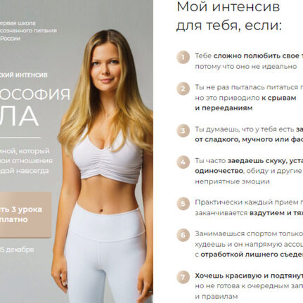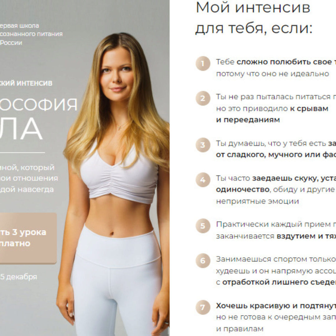 Философия тела - первое образование в России, объединяющее в себе главные принципы сбалансированного питания и психологии пищевого поведения Программа интенсива состоит из 9 уроков Урок 0. Вводный урок Урок 1. Инструменты диетомана Урок 2. Лишний вес и переедания Урок 3. Полноценное питание Урок 4.