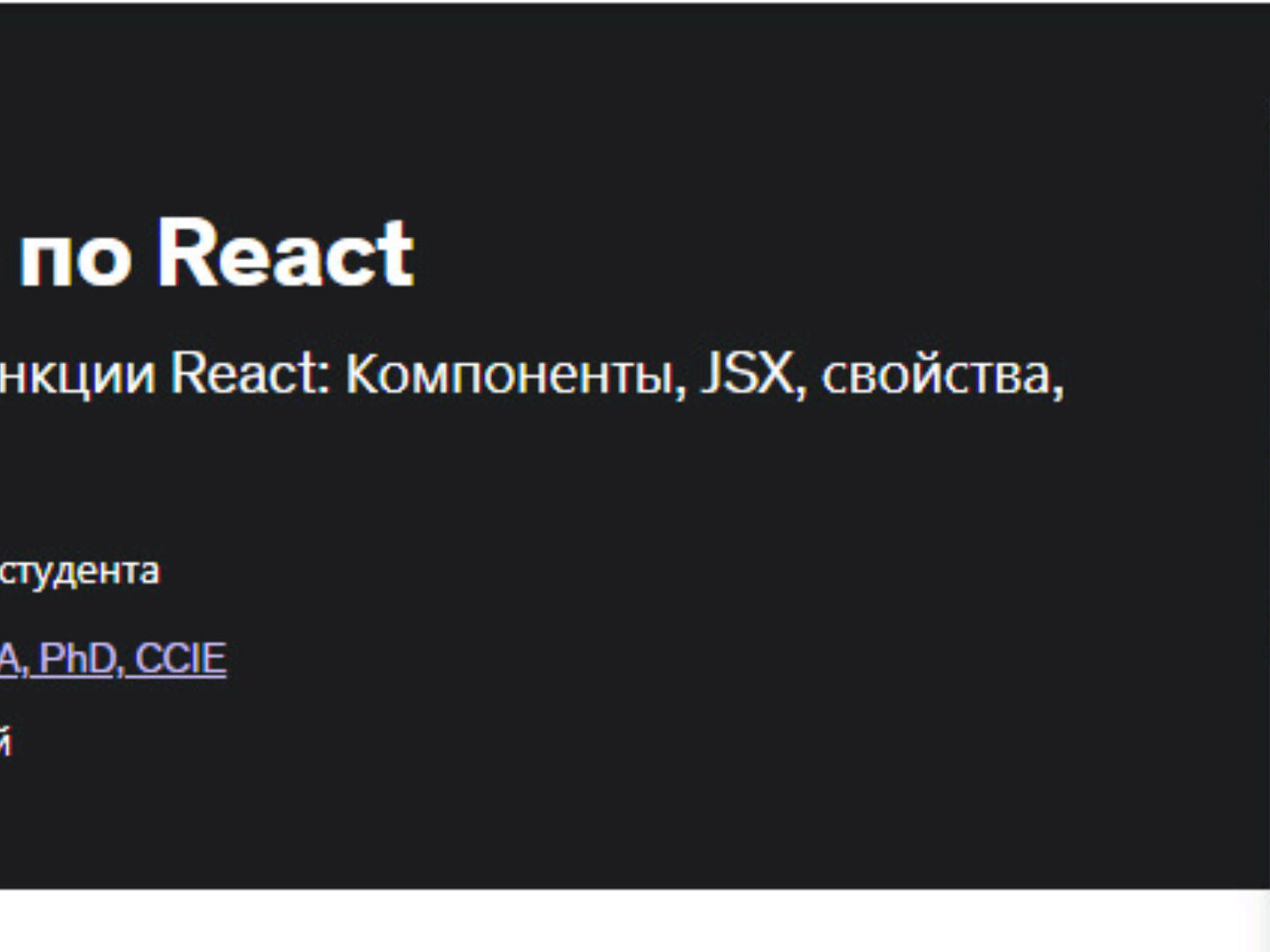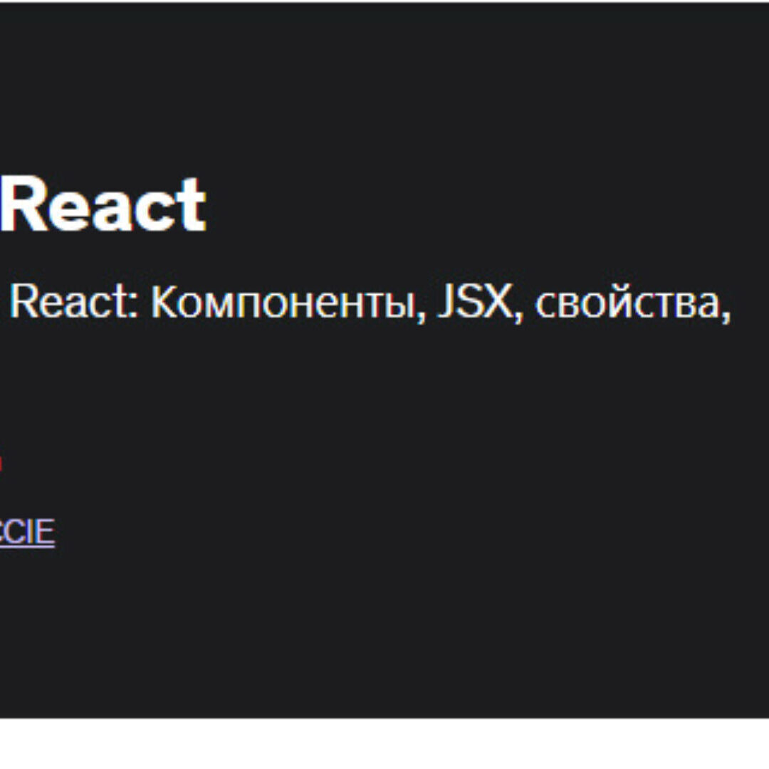 • Вы изучите основные концепции React, такие как Компоненты (Components), JSX (jаvascript Syntax Extension), Свойства (Props) и Состояние (State)