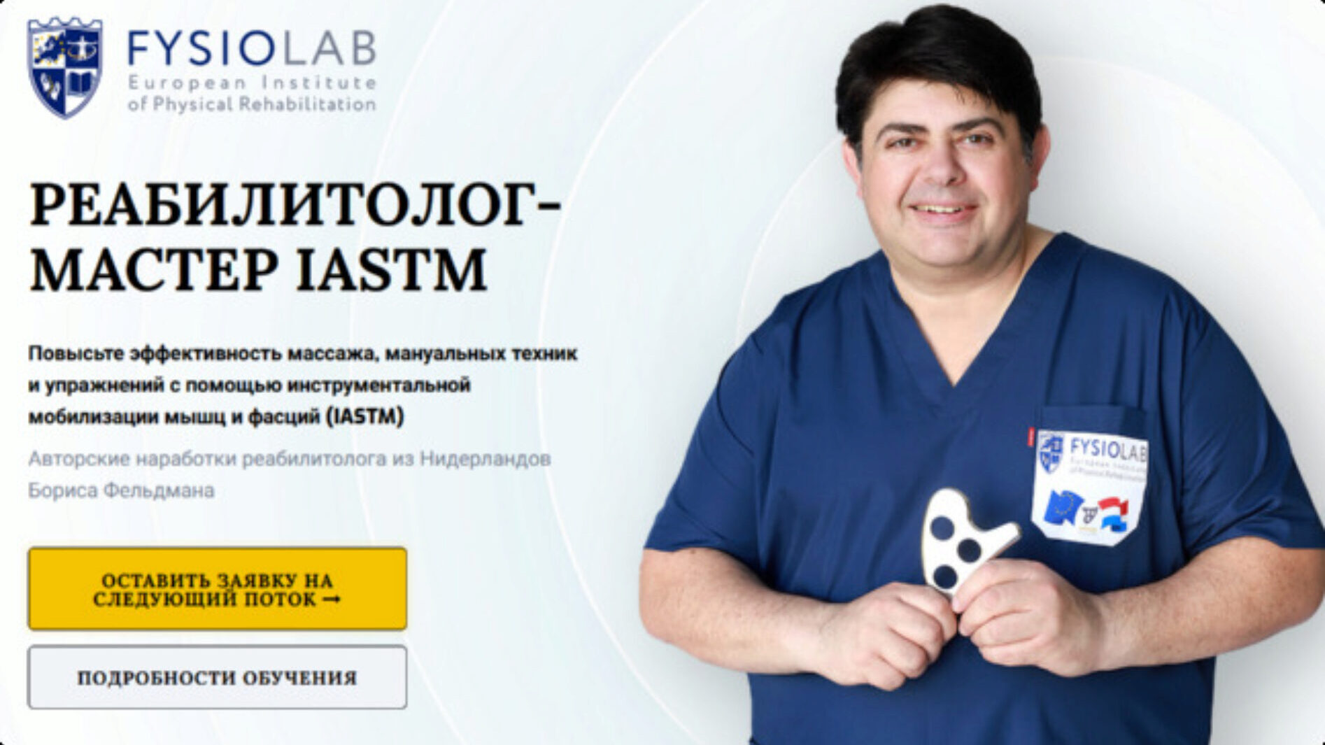 Курс Fysiolab - Реабилитолок - мастер Iastm. Тариф Слушатель, автор Борис Фельдман, Светлана Вигман. Повысьте эффективность массажа, мануальных техник и упражнений с помощью инструментальной мобилизации мышц и фасций (IASTM)