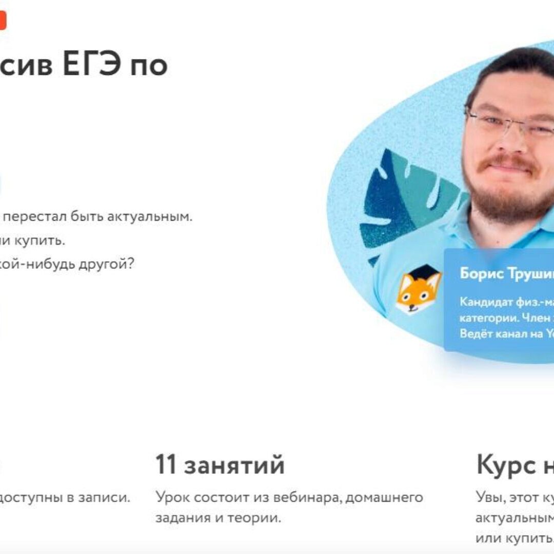 Авторский курс подготовки к ЕГЭ по профильной математике от Бориса Трушина с 0 до 70 баллов, 10-11 класс О курсе: На курсе разбирают задачи по геометрии и теории вероятностей, учат решать неравенства и логарифмические функции. Курс учит решать тестовые и практические задания ЕГЭ по математике,