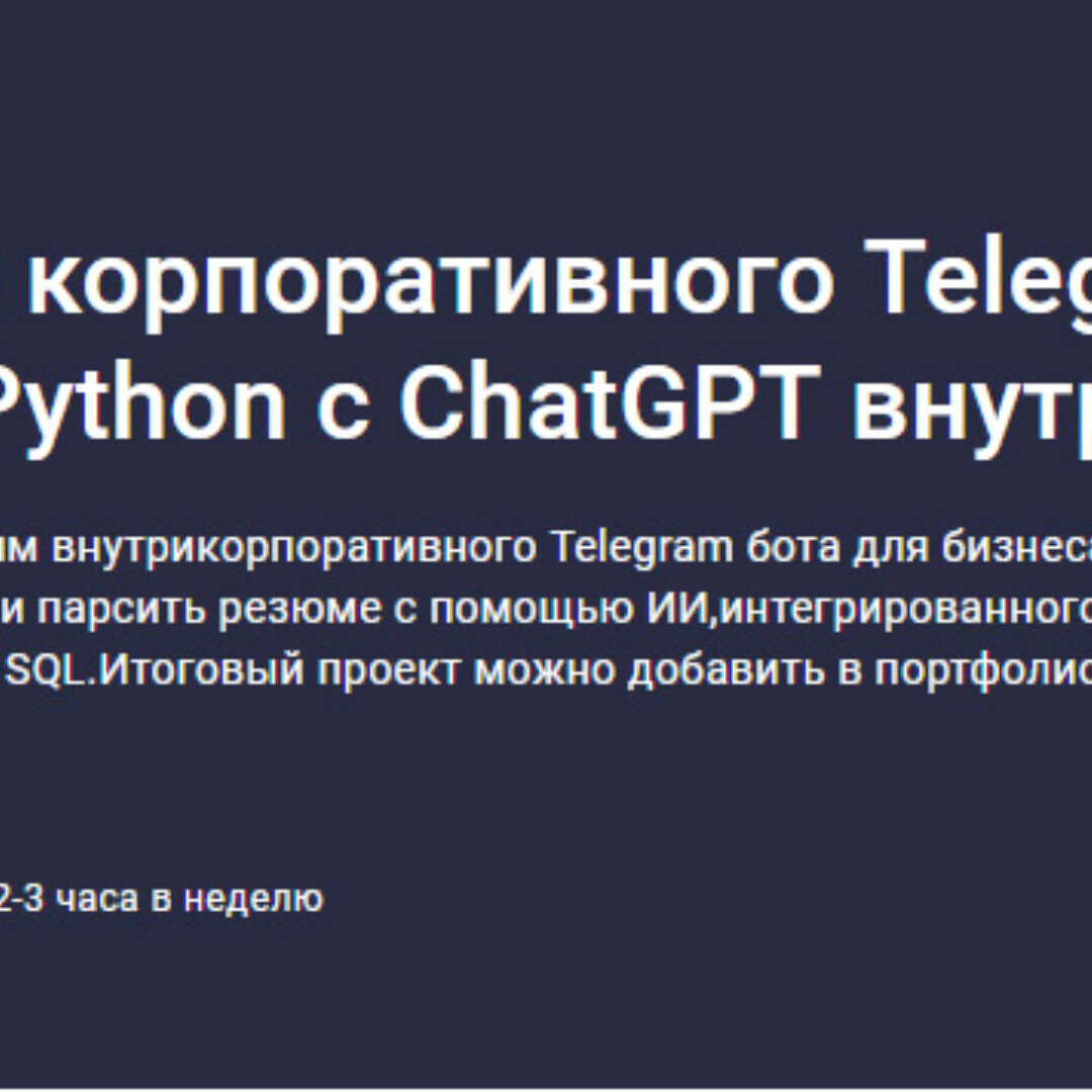 Шаг за шагом создадим внутрикорпоративного Telegram бота для бизнеса, умеющего планировать задачи и парсить резюме с помощью ИИ, интегрированного с ChatGPT и базой данных сотрудников SQL.Итоговый проект можно добавить в портфолио и продать на бирже фриланса.