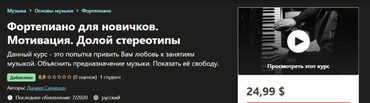 Этот курс ориентирован на взрослых людей (от 14 до 75 лет), которые ещё никогда не садились за клавишный инструмент (пианино, фортепиано, синтезатор). Курс рассчитан на 2-3 месяца обучения и включает в себя 20 частей (до 5 видеоуроков в каждом) Курс содержит 6 тестов и 10 практических заданий. Курс