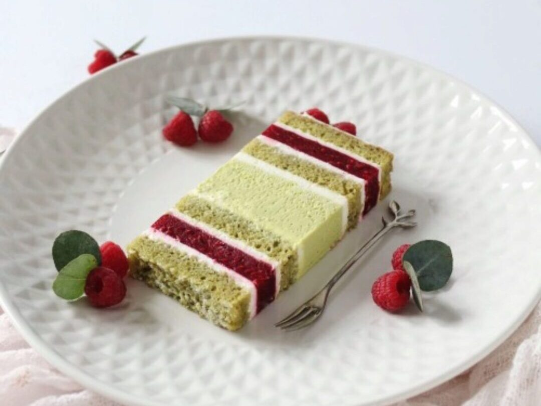 Торт «Фистащка-Малина»: Фисташковый бисквит Малиновое кули Малиновый конфитюр Фисташковый крем Фисташковый мусс Подробная технологическая карта с описанной техникой приготовления в текстовом формате PDF.