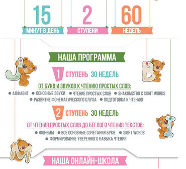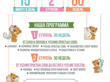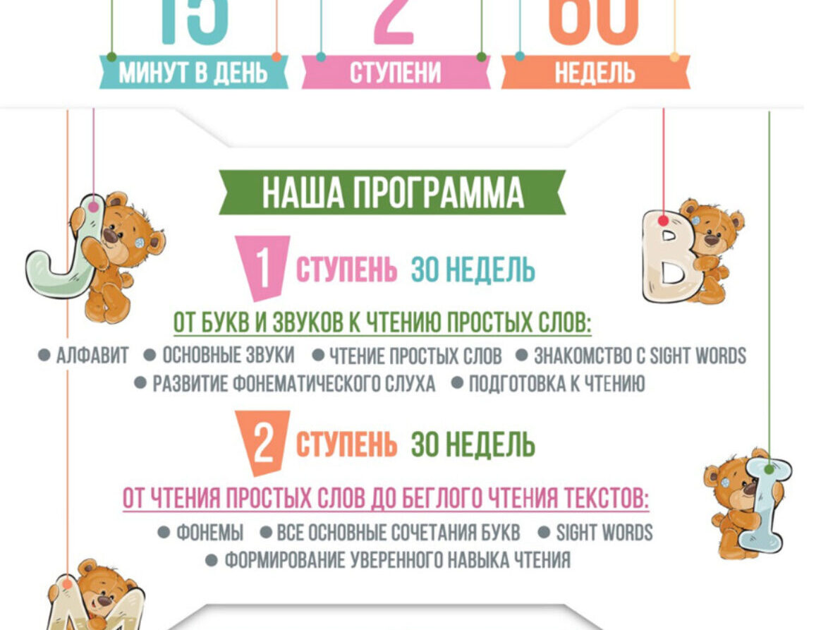 Курс основан на авторской методике ведущих специалистов по раннему английскому, подтвержденной реальными результатами. Вы просто играете вместе и ребенок учится читать на глазах!