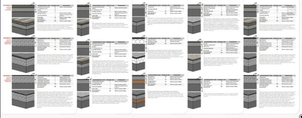Схемы устройства пирогов полов, согласованные со строителями, Подрядчиками и специалистами в сфере монтажа напольных покрытий. Файл в PDF формате.