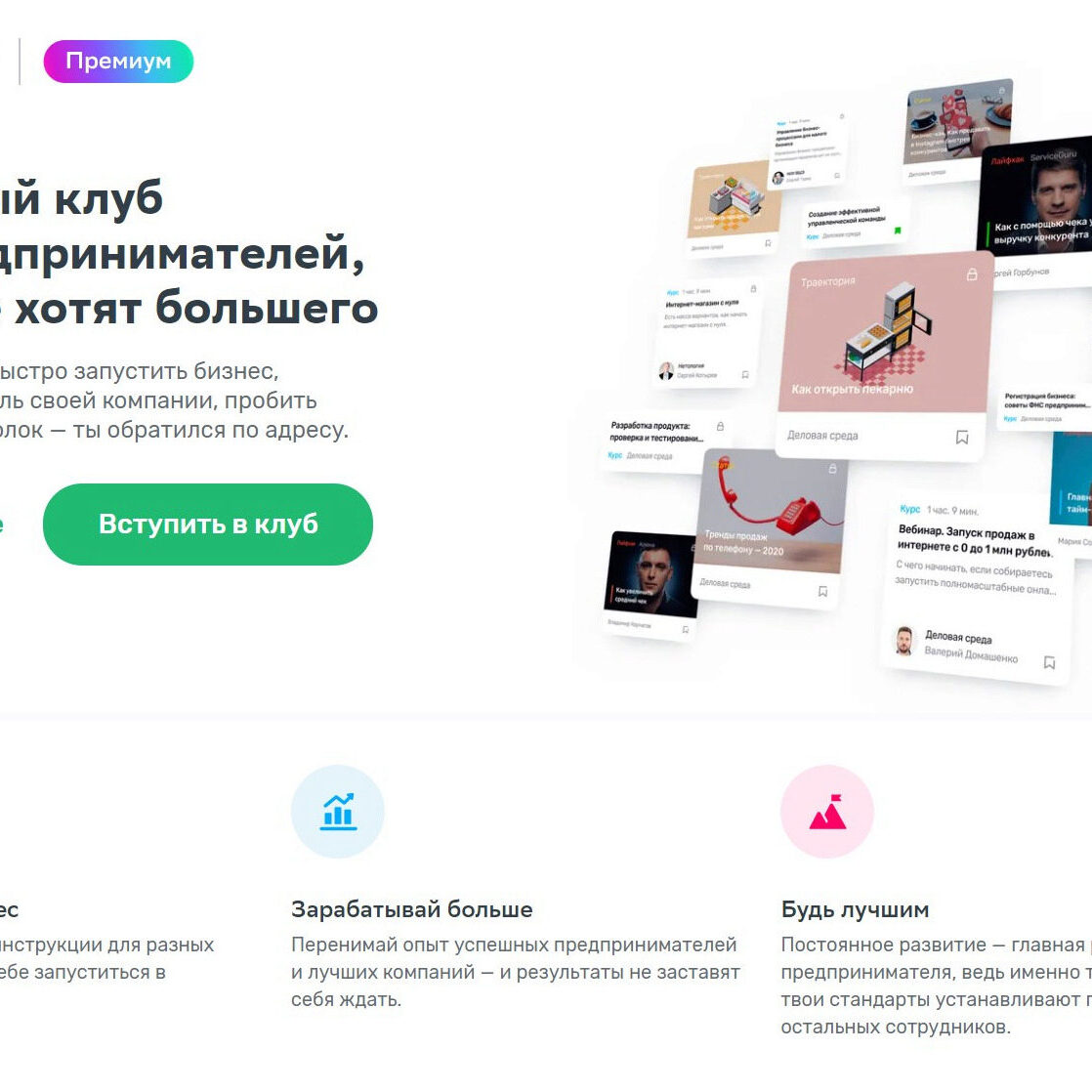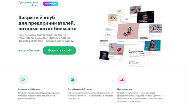 [Деловая среда Сбер] Закрытый клуб для предпринимателей, которые хотят большего. Деловая среда Премиум — закрытый клуб для предпринимателей по подписке. За небольшую ежемесячную плату ты постоянно получаешь новые рабочие способы увеличить прибыль от настоящих российских предпринимателей.