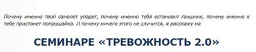 Лечение начинается с понимания проблемы. Ты знаешь свою – это тревожность. Что делать дальше, я расскажу на семинаре.