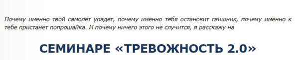 Человек покупает у нас материал по вебинару. Материал высылается файлом, отправка занимает минуты, дольше идет транзакция. Но через 10 дней человек перезванивает и сообщает, что не получил материал. При этом он смущен, он с трудом формулирует мысль, ему тяжело дается общение по телефону. Он ждал 10 дней, чтобы уточнить, выслали ли ему на элекронку файл. И 10 дней его съедала тревога перед общением с нашим консультантом. Это пример тревожности, о которой пойдет речь на семинаре «Тревожность 2.0»