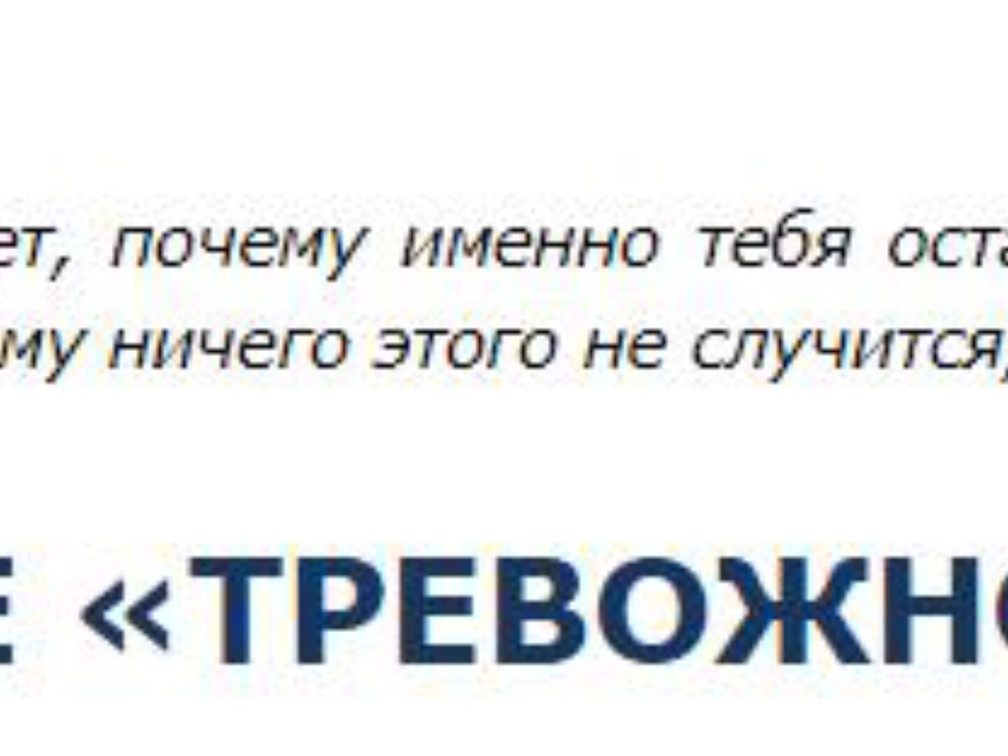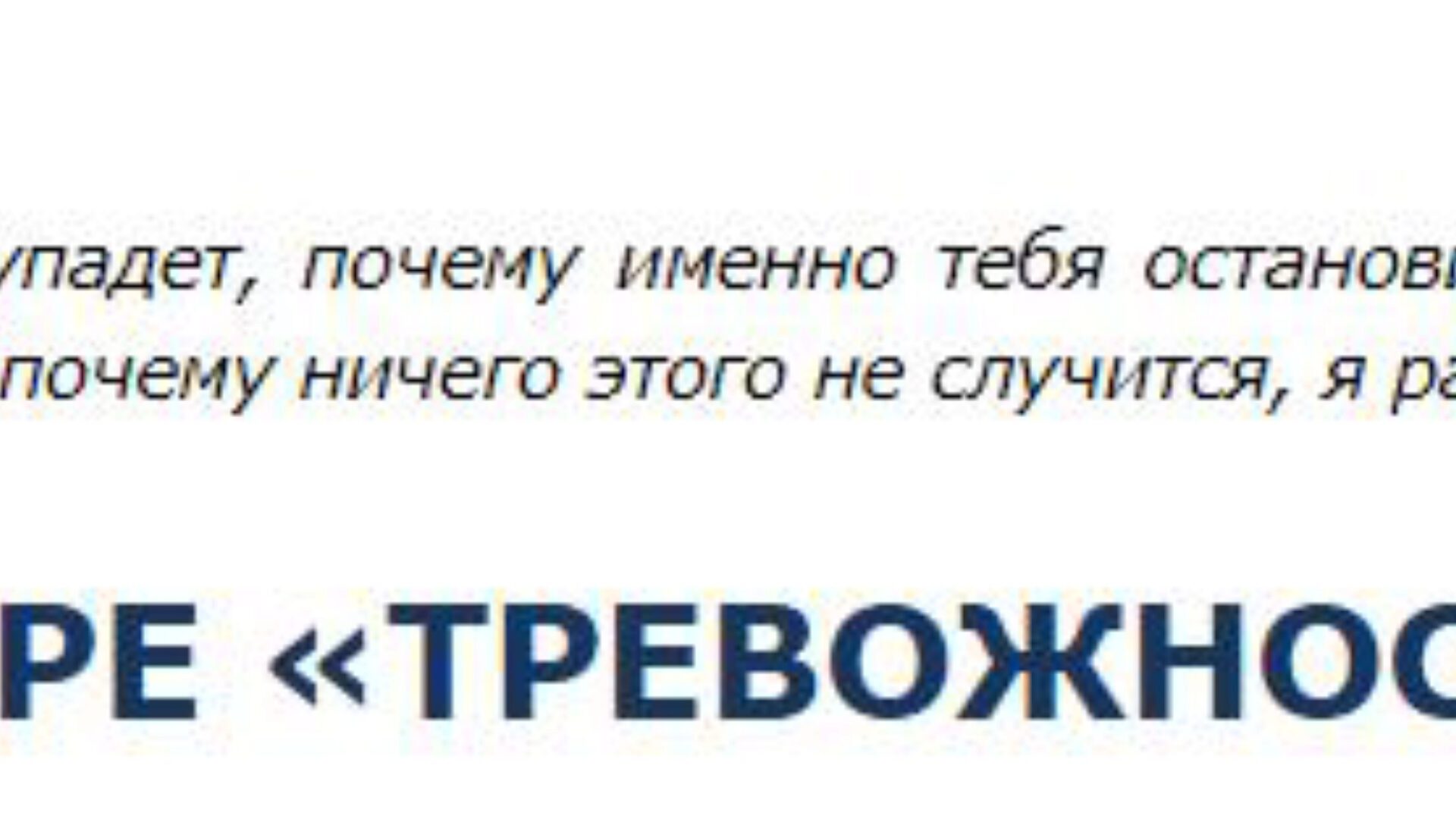 ДЛЯ КОГО ДАННЫЙ ВЕБИНАР Для всех, кто страдает от любых форм и степеней тревоги. ОПИСАНИЕ ВЕБИНАРА Вы получите конкретные рекомендации по работе со своей тревожностью из уст ведущего психотерапевта России, специалиста в области когнитивно-поведенческой терапии. Что такое тревожно-мнительный