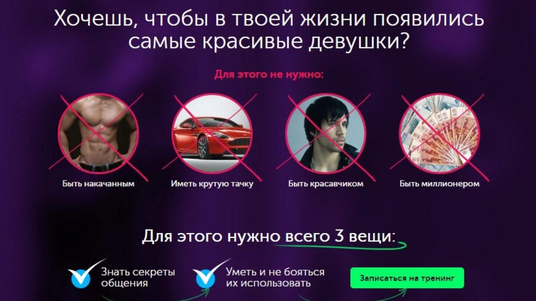 В РЕЗУЛЬТАТЕ ТРЕНИНГА ТЫ: Начнешь притягивать женщин силой своей личности В несколько раз увеличишь количество внимания со стороны женского пола Женщины начнут с тобой флиртовать и оказывать знаки внимания Будешь вызывать ощущение у женщин, что ты «особенный» Сможешь заинтересовать любую