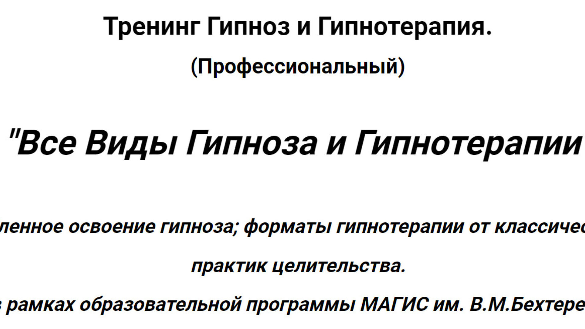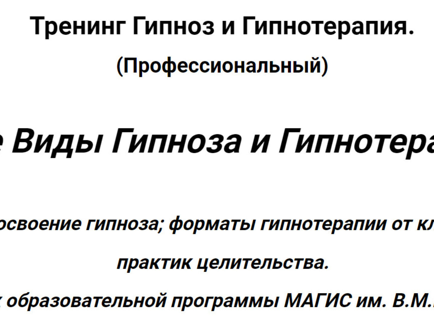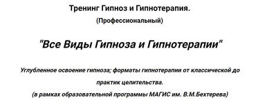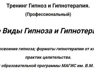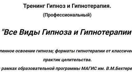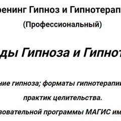 Все виды гипноза – рассчитан от первоначального освоения гипноза, до профессионального уровня владения. Разработчики программы (ДПО) и авторы методик обучения. Преподаватели ведущие тренинг, практикующие гипнотерапевты. Диана Орлова – Гипнотерапевт, психолог, специалист по применению гипноза в