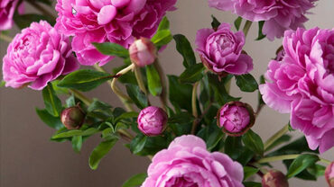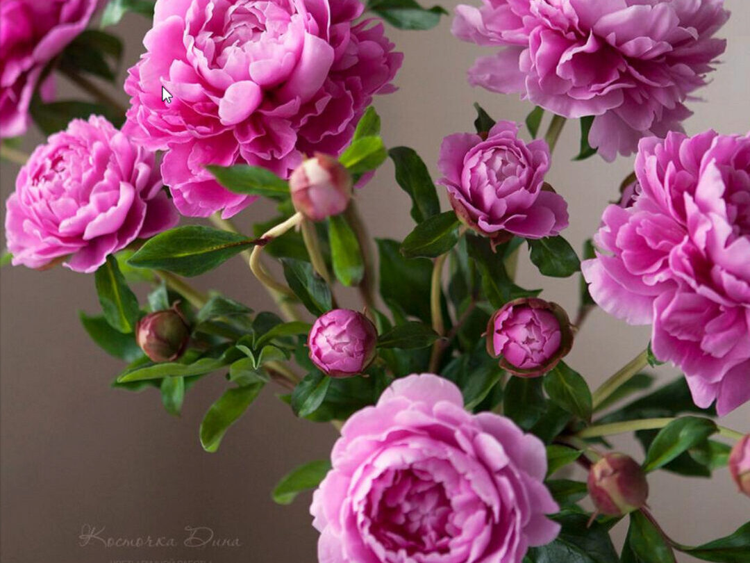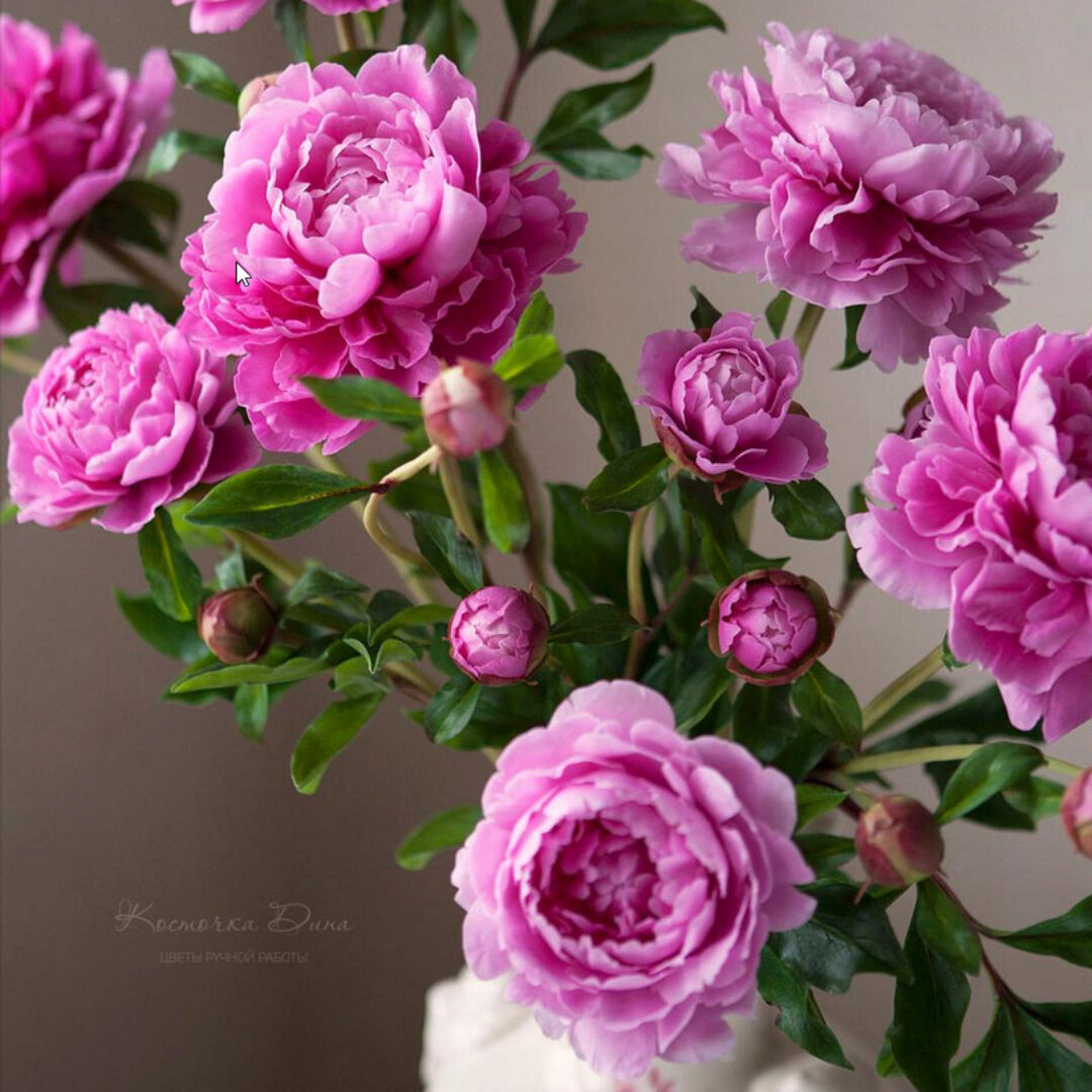 Курс Розовые пионы, автор Дина Косточка. • В курсе не просто один цветок, а полноразмерная ветка с большим раскрытым цветком, несколькими разными бутонами и листьями разной конфигурации, собранные от одного до пяти.