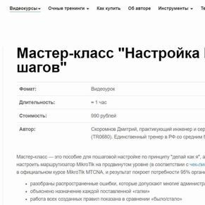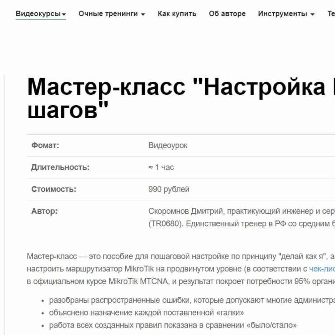 Курс Мастер-класс «Настройка MikroTik за 15 шагов» 2019, автор Дмитрий Скоромнов. Мастер-класс — это пособие для пошаговой настройке по принципу «делай как я», а не учебный курс. По мастер-классу можно настроить маршрутизатор MikroTik на продвинутом уровне (в соответствии с чек-листом). Настройка более сложная чем дается в официальном курсе MikroTik MTCNA, и результат покроет потребности 95% организаций. В мастер-классе: