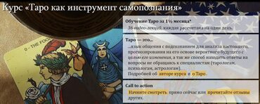 Это курс для тех, кто хочет: — профессионально вести консультации по темам финансов, работы и бизнеса, помогая своим клиентам повышать свой доход и получить лучшие условия работы — освоить дополнительные сферы консультирования и привлекать больше клиентов — превратить свою колоду Таро в верного
