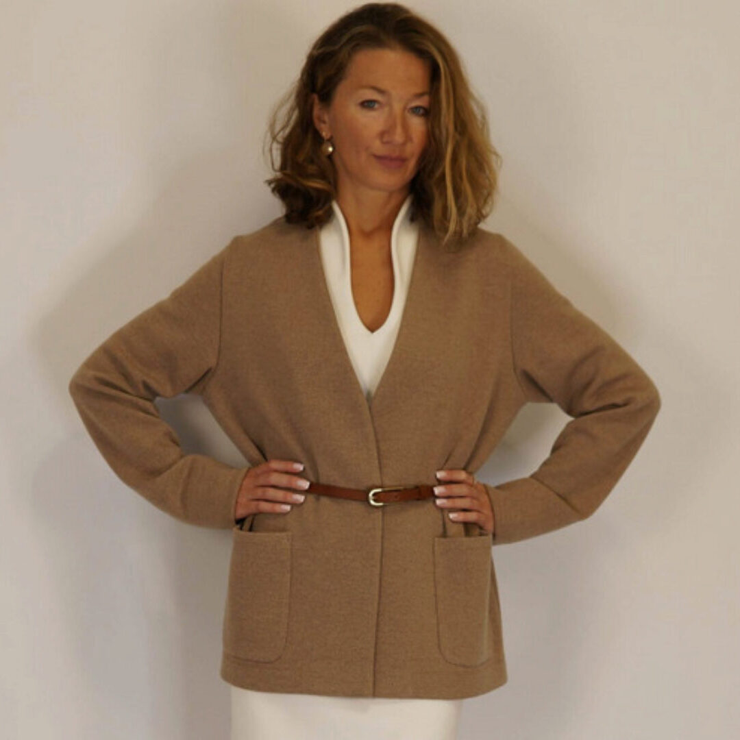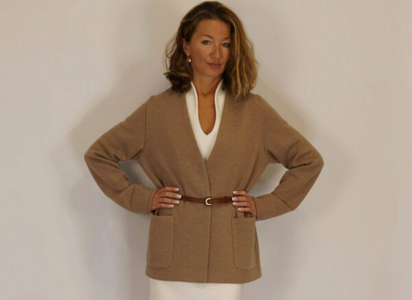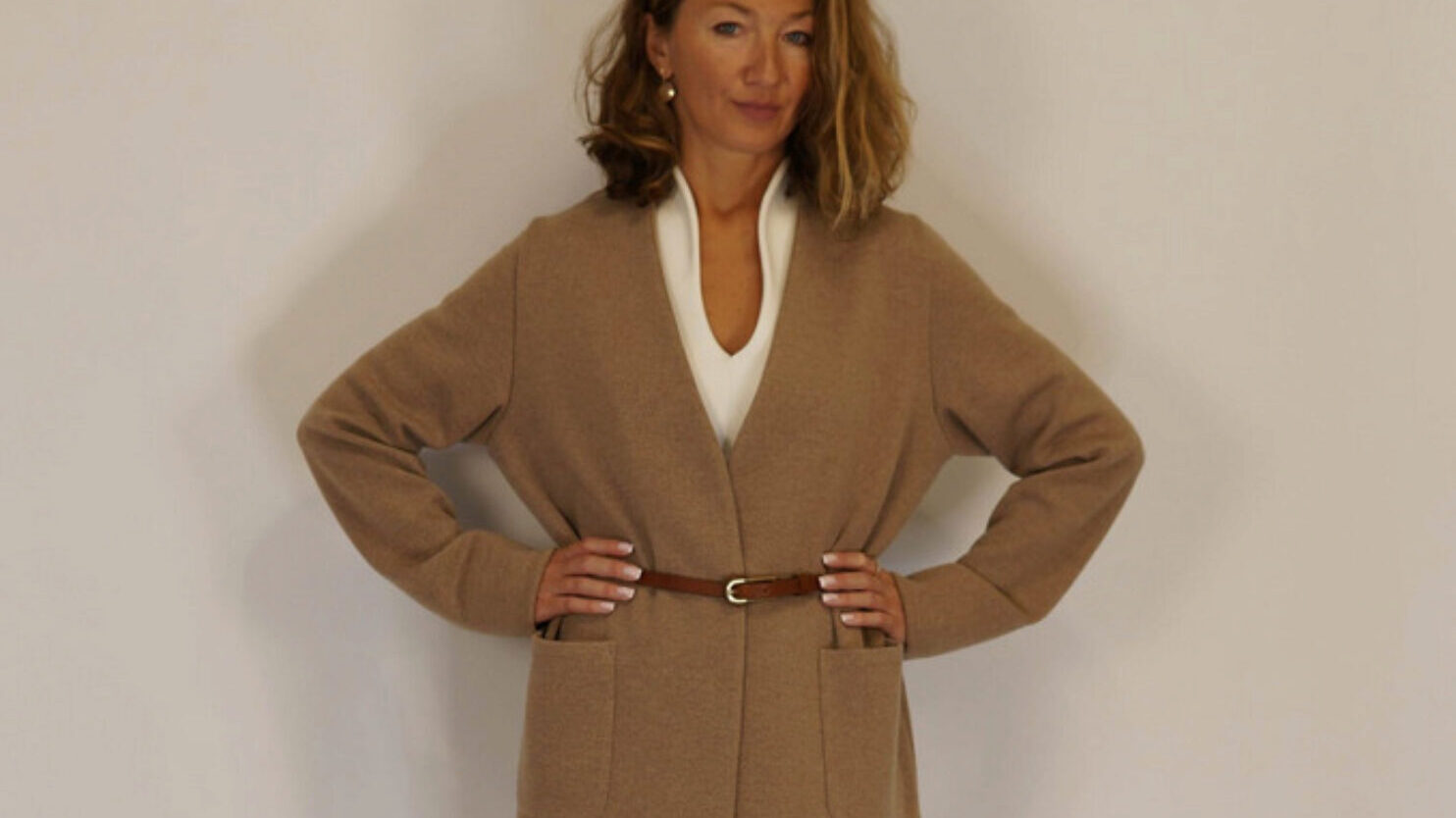 Для пошива данной модели рекомендуется выбирать материалы умеренной плотности. Кардиган на фото Elenapatternstudio выполнен из шерстяного вязаного трикотажа плотностью ~450-500 г/м