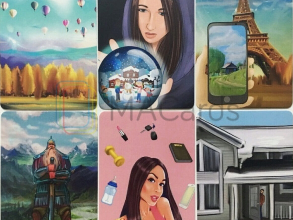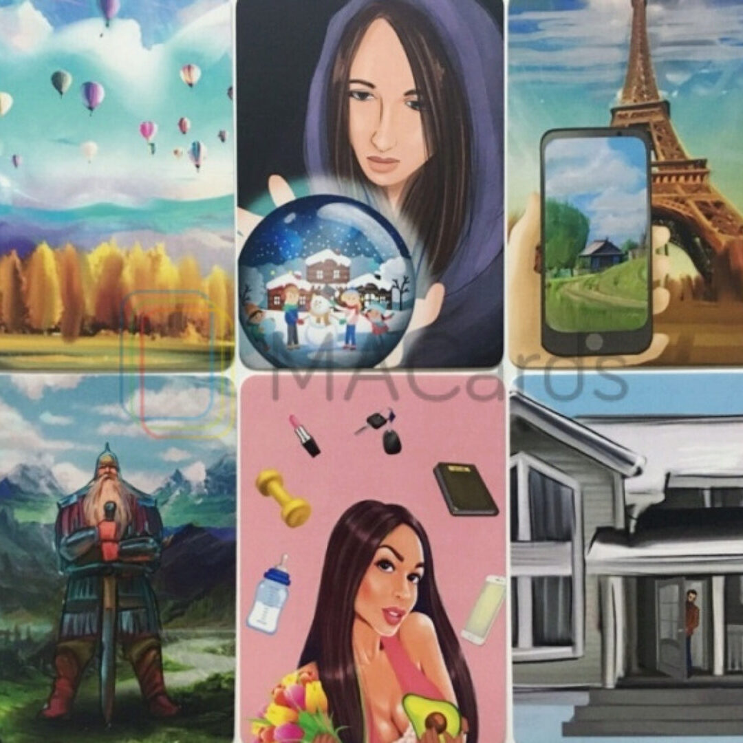 Две колоды по 88 карт каждая – одна состоит из картинок, другая из слов. Поместите карту с изображением в обрамление карты со словом и исследуйте значение этой комбинации. Возможны 7744 различных комбинаций, и множество интерпретаций. Используйте отдельно каждую колоду как пасьянс и вместе для