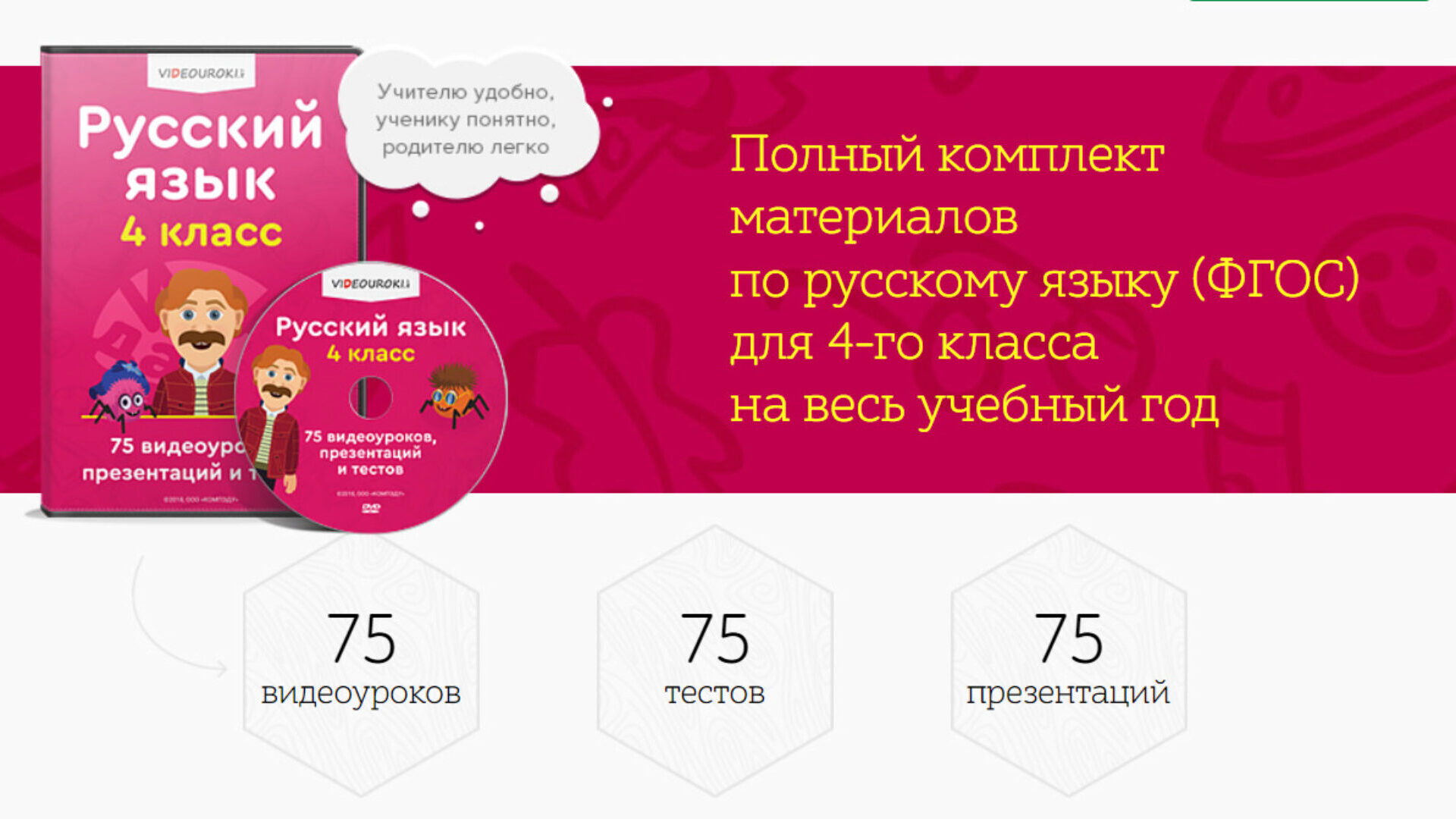 - Содержит 75 видеоуроков, 75 презентаций и 75 тестов.