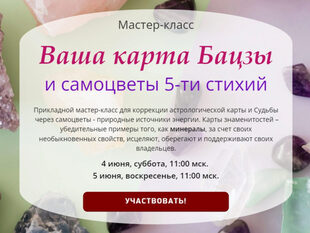 На двухдневном мастер-классе вы изучите и освоите основные способы «встраивания» самоцветов в карту Бацзы для приведения ее к балансу, а жизнь – к гармонии.