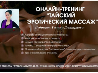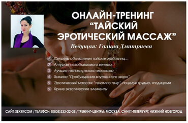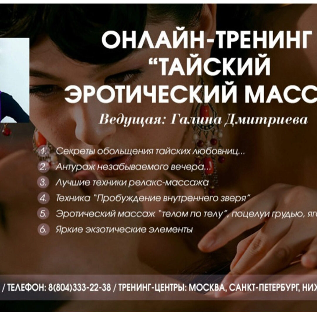 С демонстрацией на реальных женщинах Позволит каждому мужчине получить рабочие техники, стать увереннее в себе и полностью контролировать ситуацию в постеле За неделю ты получишь 10 лет моего опыта работы в салонах эротических массажей В своей работе я использую элементы баллийского, тайского,