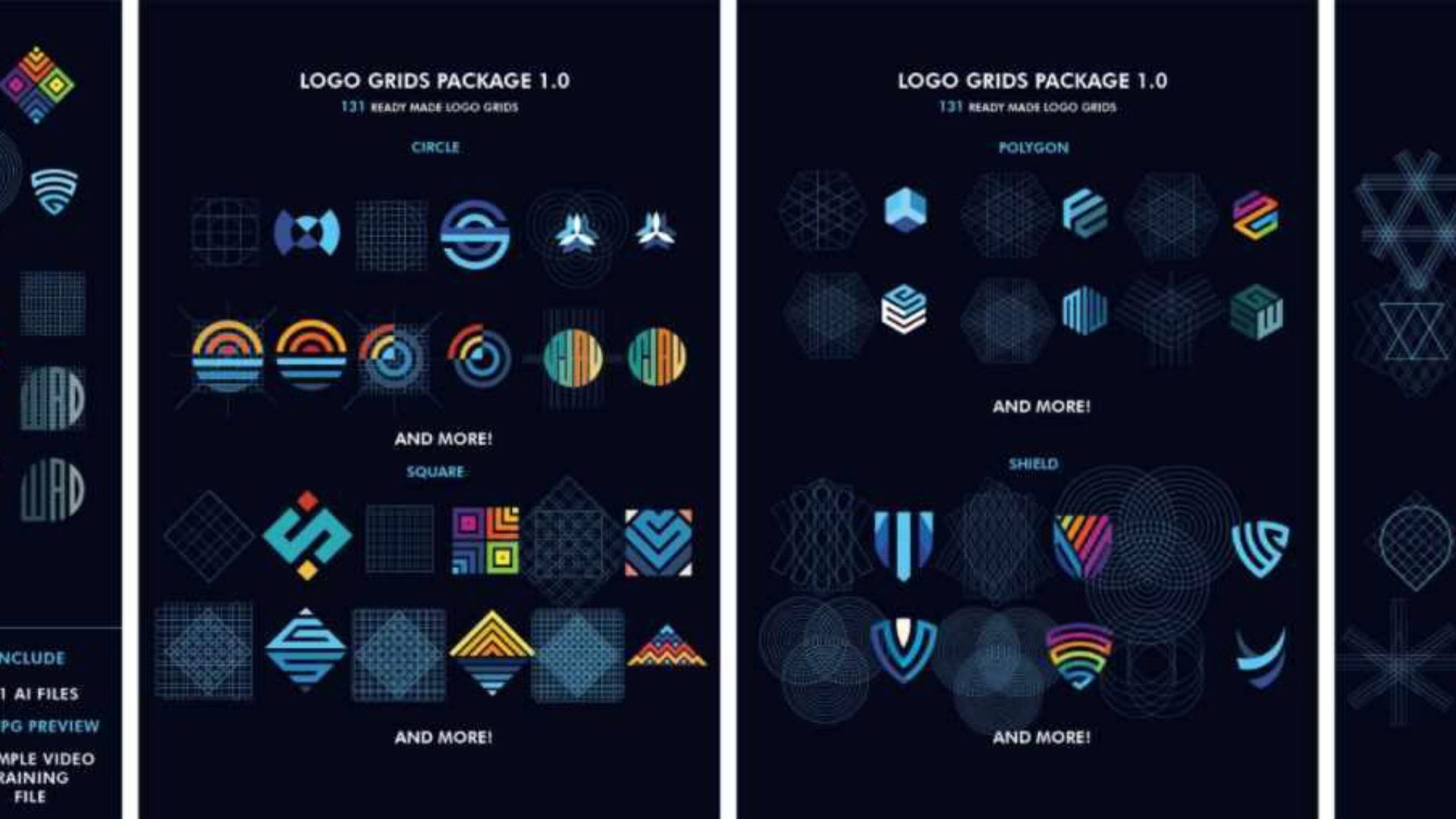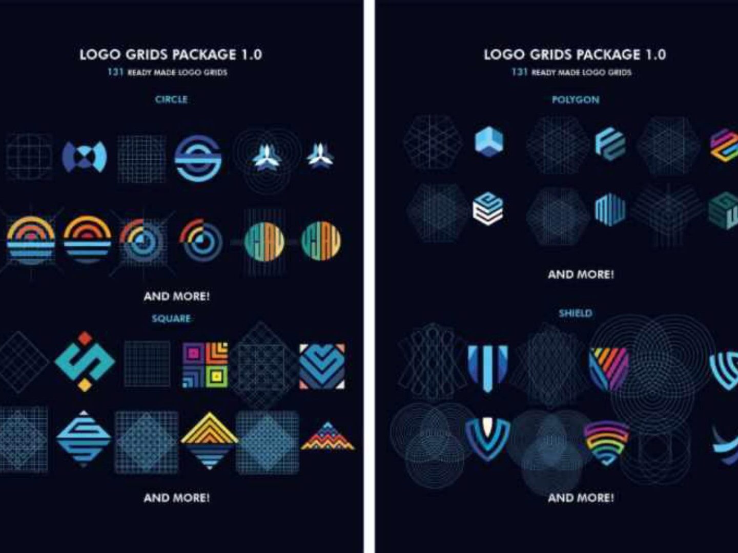 131 ready made logo grids. circle - square - triangle - polygon - shield - pin - star - diamond