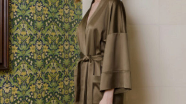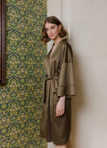 Изысканный шёлковый халат-кимоно «Бри» – стильное и удобное решение для домашнего гардероба любой женщины. Удобная посадка халата «Бри» обеспечивает свободу движений и подходит для отдыха, сна и проведения времени в кругу семьи или друзей. У модели спущенный рукав и удобный воротник-стойка. Все швы
