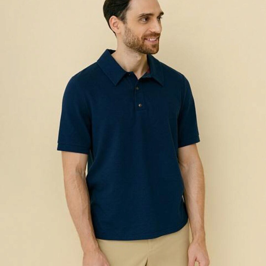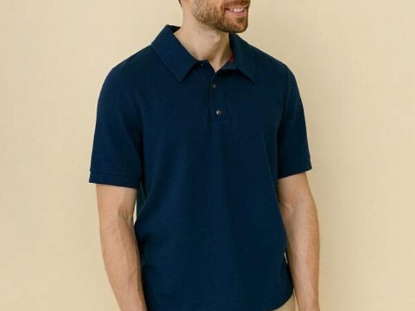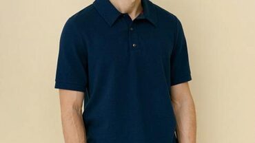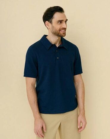 Мужская футболка-поло прямого силуэта, длиной до линии бедер. На переде застежка-поло. Горловина обработана стояче-отложным воротником с цельнокроеной стойкой. Рукав короткий рубашечный, на притачной манжете.