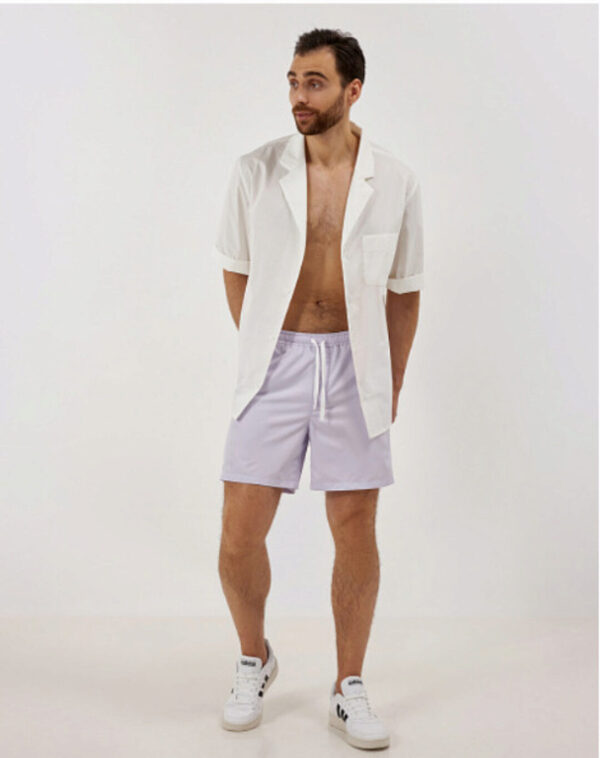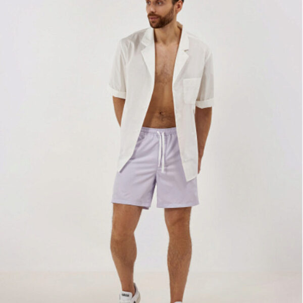 Выкройка шорт. Шорты прямые, выше колена, с застежкой «гульфик». Передние половинки имеют карманы из бокового шва с косым входом. Также на передних половинках присутствует по две складки с каждой стороны. На задней половинке справа имеется карман «в рамку». Верхний срез обработан притачным поясом.