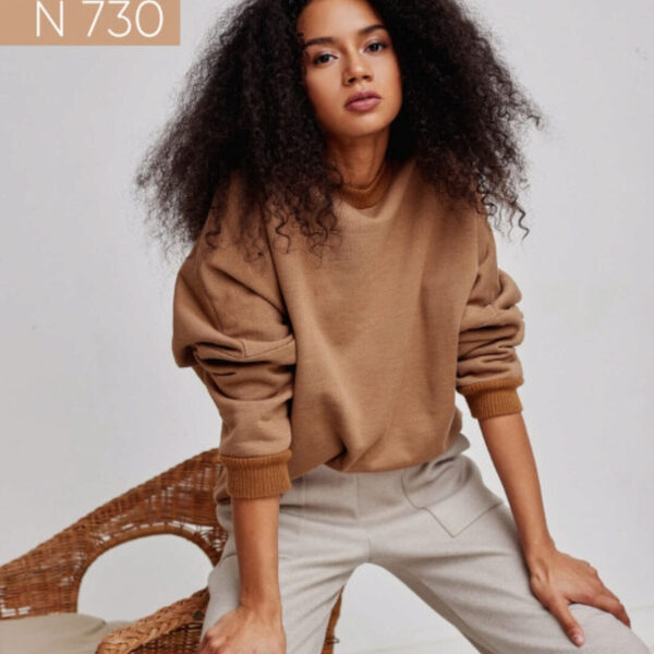 Рекомендуемый материал для пошива: для пошива модели мы рекомендуем использовать хлопчато-бумажный футер плотностью 250-300 г/м2 , с коэффициентом растяжимости 0,7 – 0,8; а также трикотаж рибана или кашкорсе для бейки горловины.