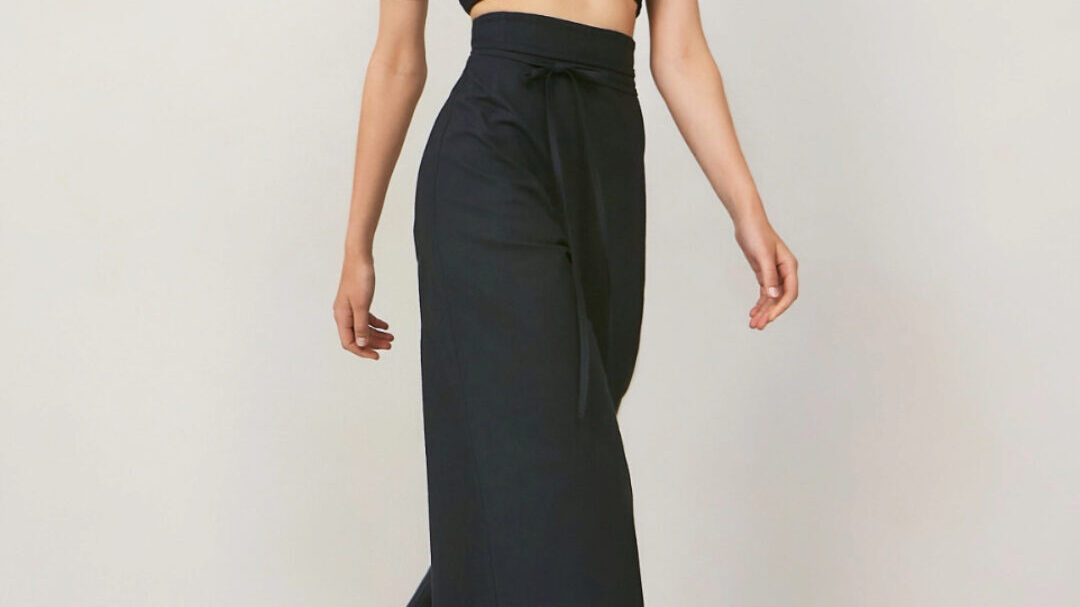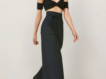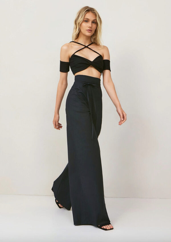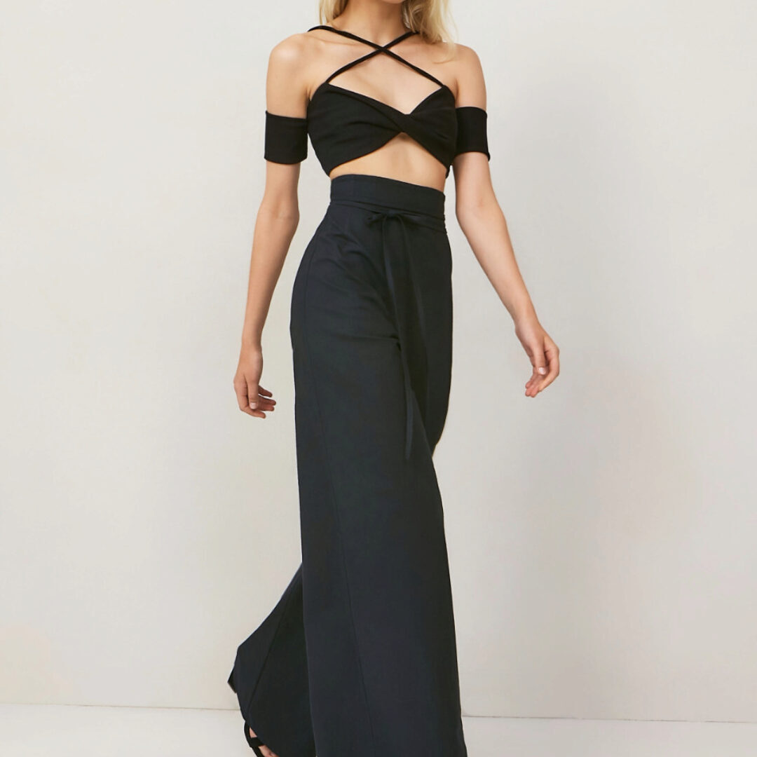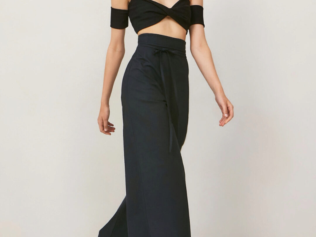 Широкие брюки палаццо А-силуэта с цельнокроенным поясом, обработанным обтачкой, с застежкой на потайную тесьму-молнию в боковом шве. Брюки имеют плотное прилегание по талии и усиленное расширение от бедра к низу.