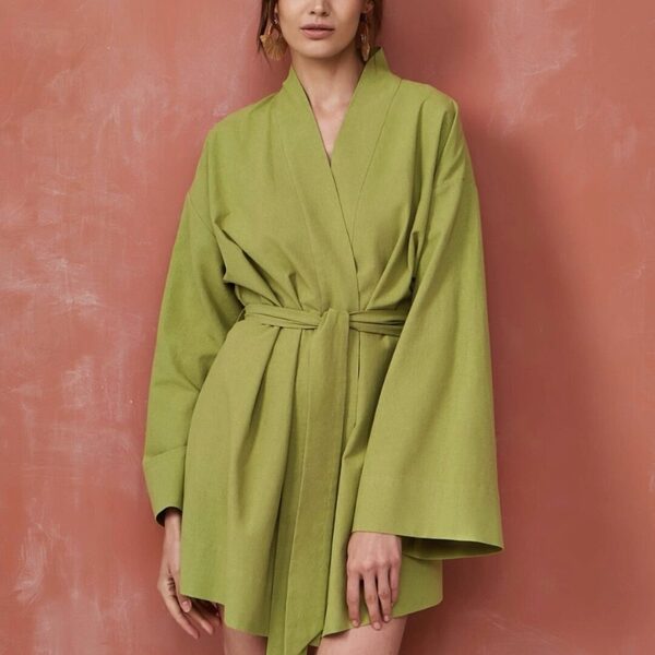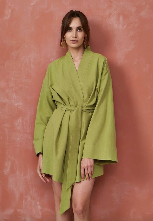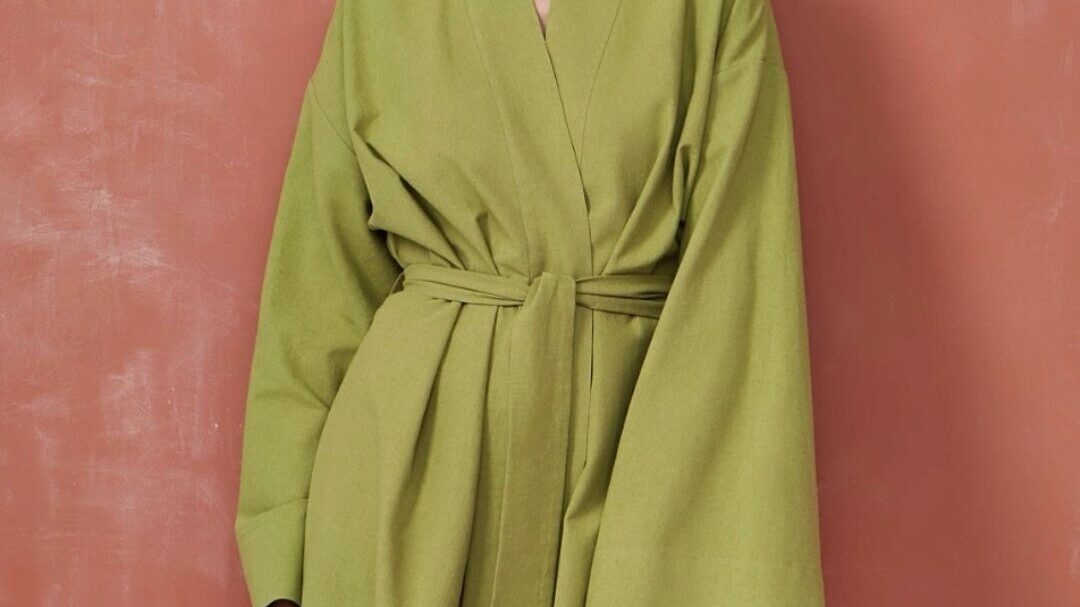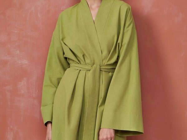 Кимоно сшито из костюмного льна, состав 100% лен, плотность 190 гр/м².