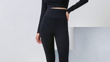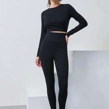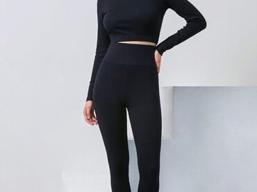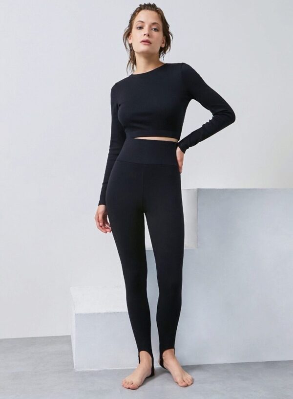 Леггинсы без бокового шва, со штрипками по низу. Пояс притачной шириной 10 см, с эластичной лентой. Штрипки цельнокроенные, срезы обработаны на плоскошовной машине.