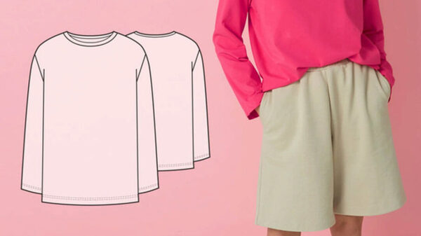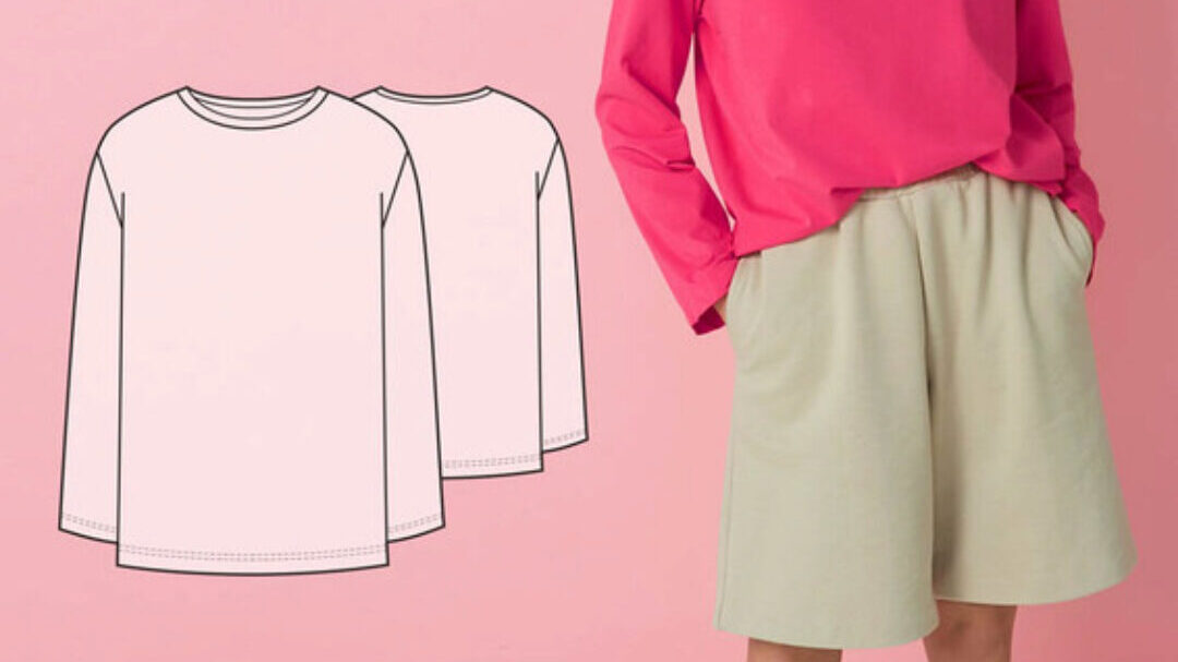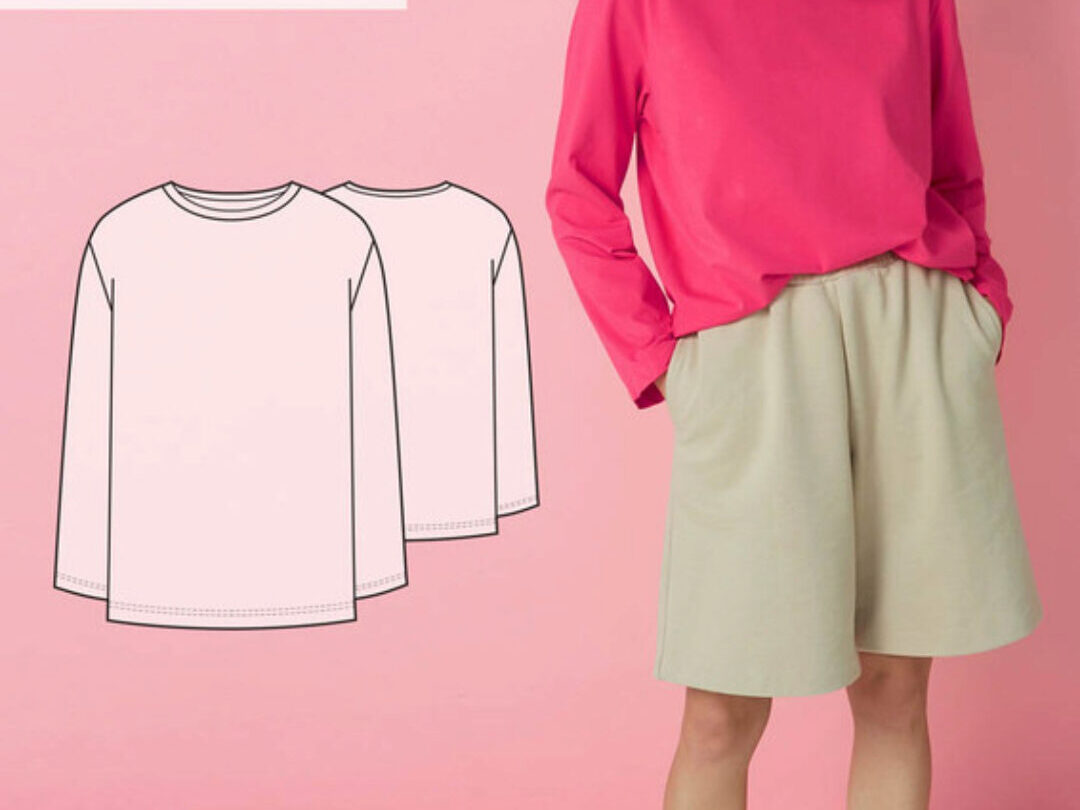 Лонгслив свободного кроя прямого силуэта с втачным рукавом. Плечо удлинено примерно на 3 см. Горловина обработана бейкой. Низ лонгслива и низ рукавов обработаны на плоскошовной машине.
