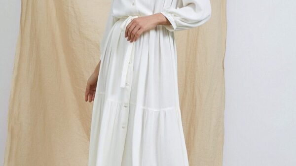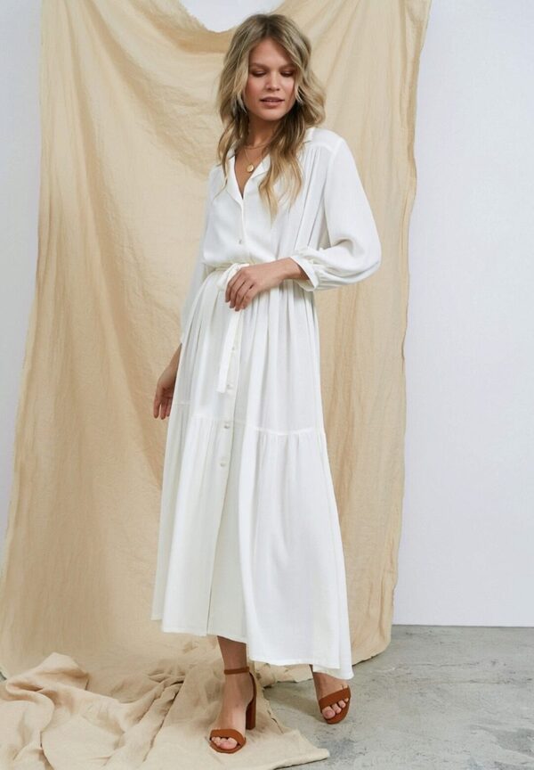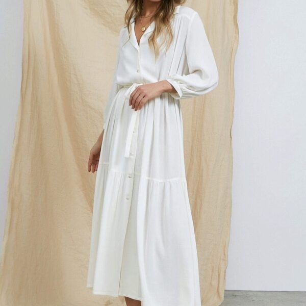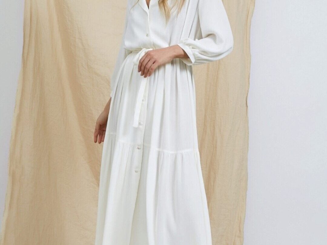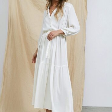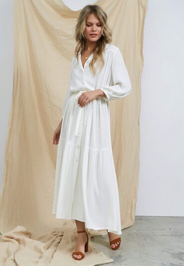 Платье-рубашка свободного кроя, А-силуэта. Воротник отложной с лацканами. По верхней части переда и спинки притачные кокетки. Нижняя часть платья из двух ярусов со сборкой. Рукава втачные объёмные, длина ¾, по низу со сборкой и манжетами. Застежка на 9 петель и пуговиц. В комплекте завязывающийся пояс.
