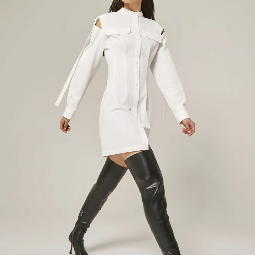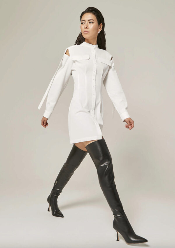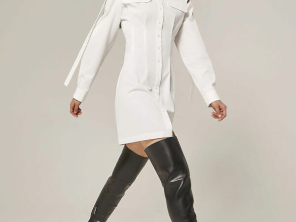 Платье-рубашка длиной мини, прилегающего силуэта с центральной застежкой на прорезные петели и пуговицы на цельнокроенной планке. Перед с застроченными складками в области талии, с накладными клапанами на уровне груди. Спинка на двойной кокетке, с застроченными складками. К окату притачана петля, с вставленными в нее полукольцами. Рубашка с притачным воротником-стойкой.