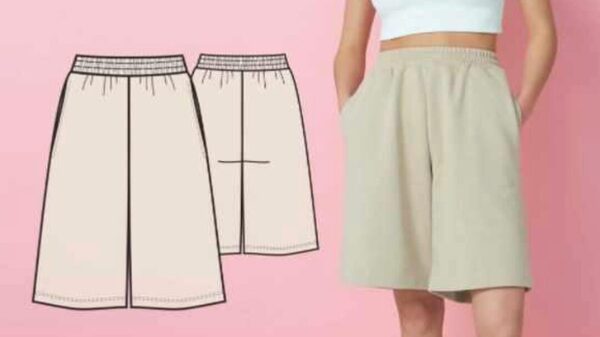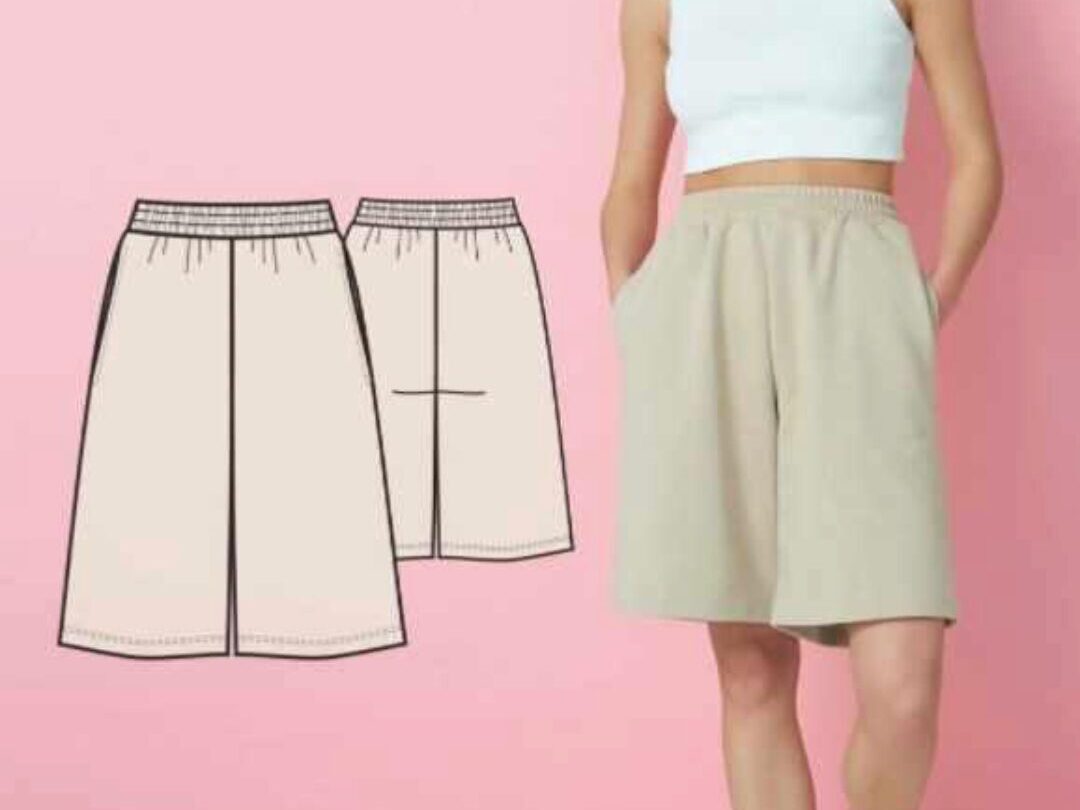 Женские шорты среднего объема, карманы с отрезным бочком, двойной притачной пояс из основной ткани, внутри пояса эластичная тесьма шириной 5 см, длина шорт до середины бедра. Рекомендуемые материалы – костюмные, сорочечные и плательно-блузочные ткани, например, штапель, лён, муслин, тонкий