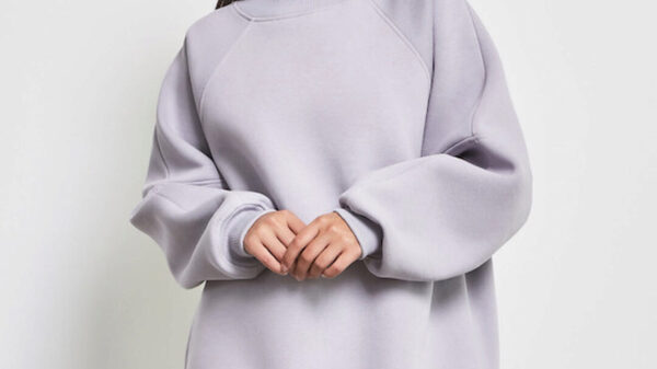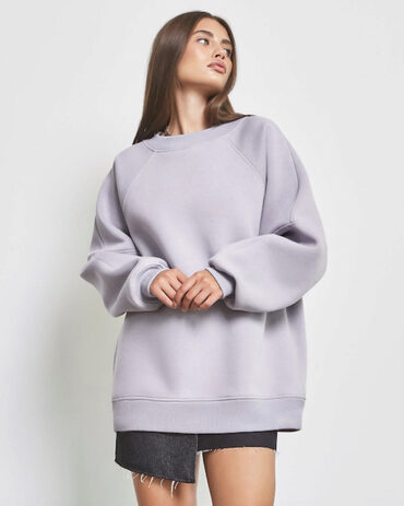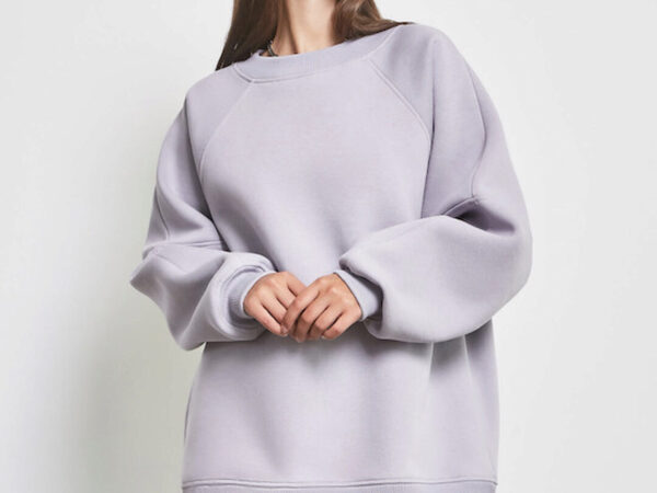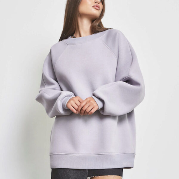 Свитшот большого объема. Горловина округлой формы, обработана бейкой из кашкорсе. Рукав реглан с верхним швом (от горловины до низа) и с горизонтальным членением. По низу свитшота и рукавов выполнены притачной пояс и манжеты из кашкорсе.