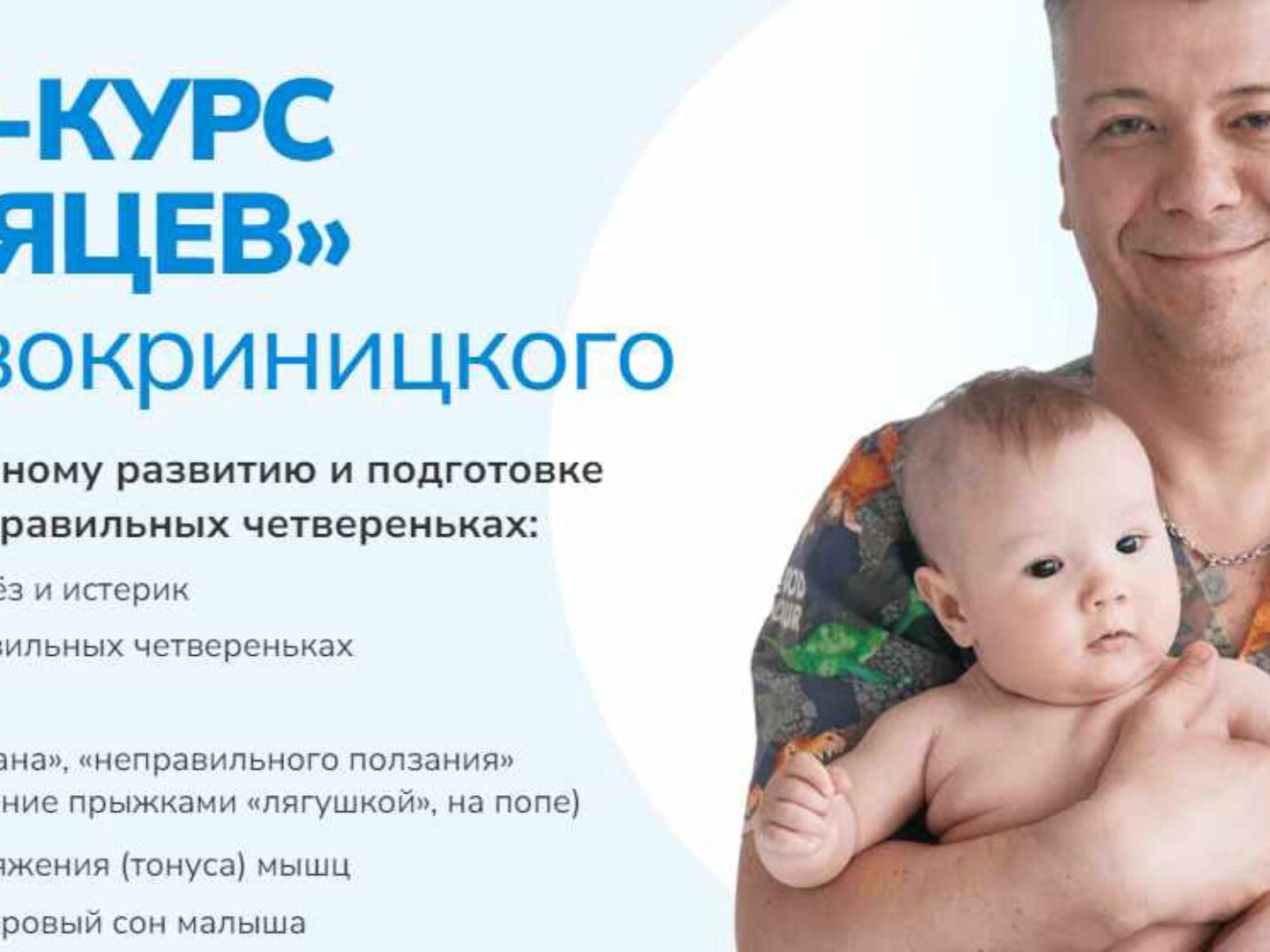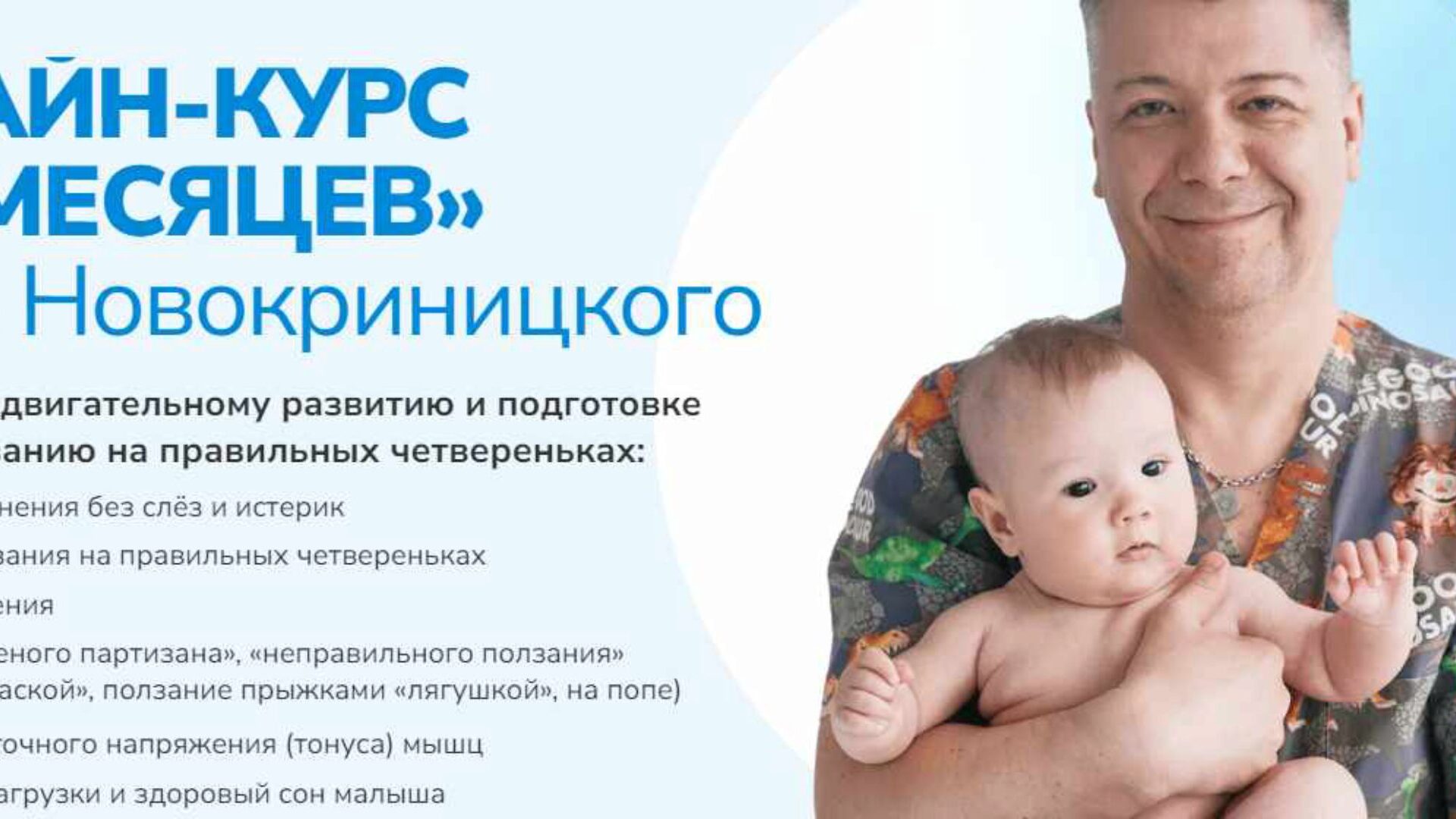 Массажист Игорь НОВОКРИНИЦКИЙ: Адепт ползания и раннего физического развития 0+. Автор видео-курса раннего физического развития «Малышовый фитнес» для детей с первого месяца Онлайн курс 3-6 месяцев Игоря Новокриницкого: Подготовьте малыша к активному движению и ползанию за 3 недели благодаря