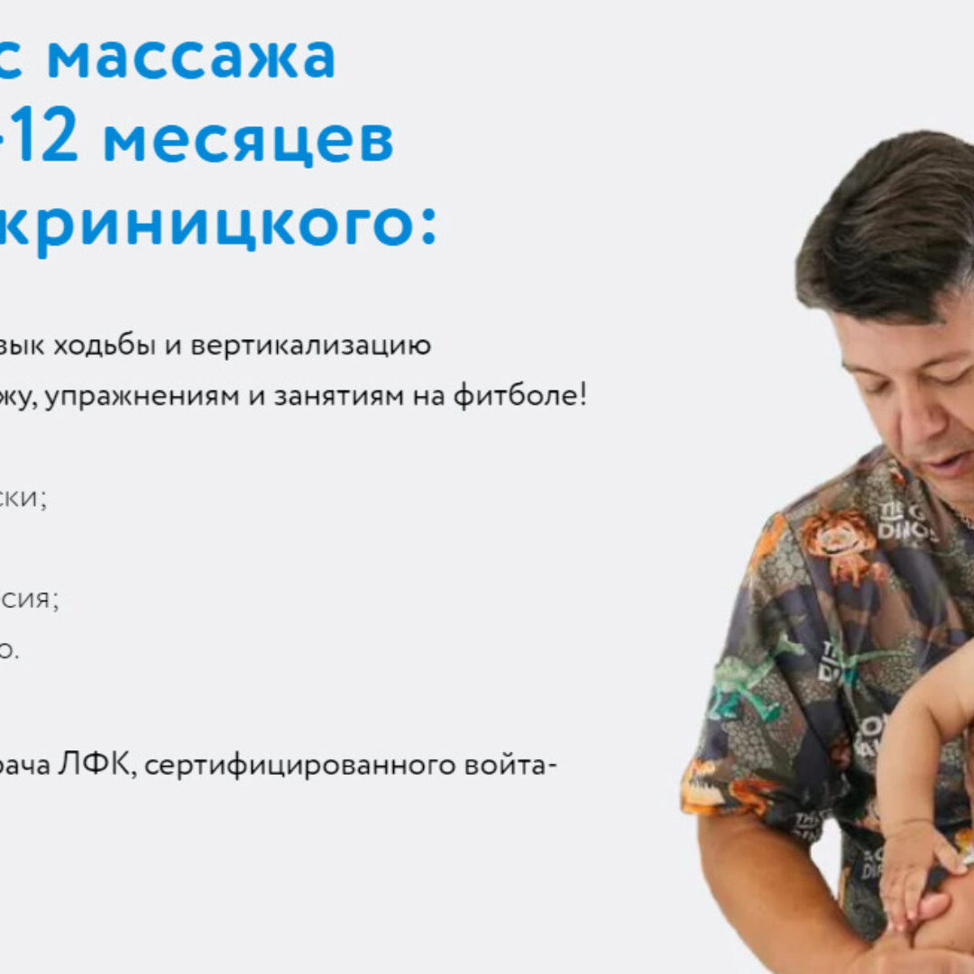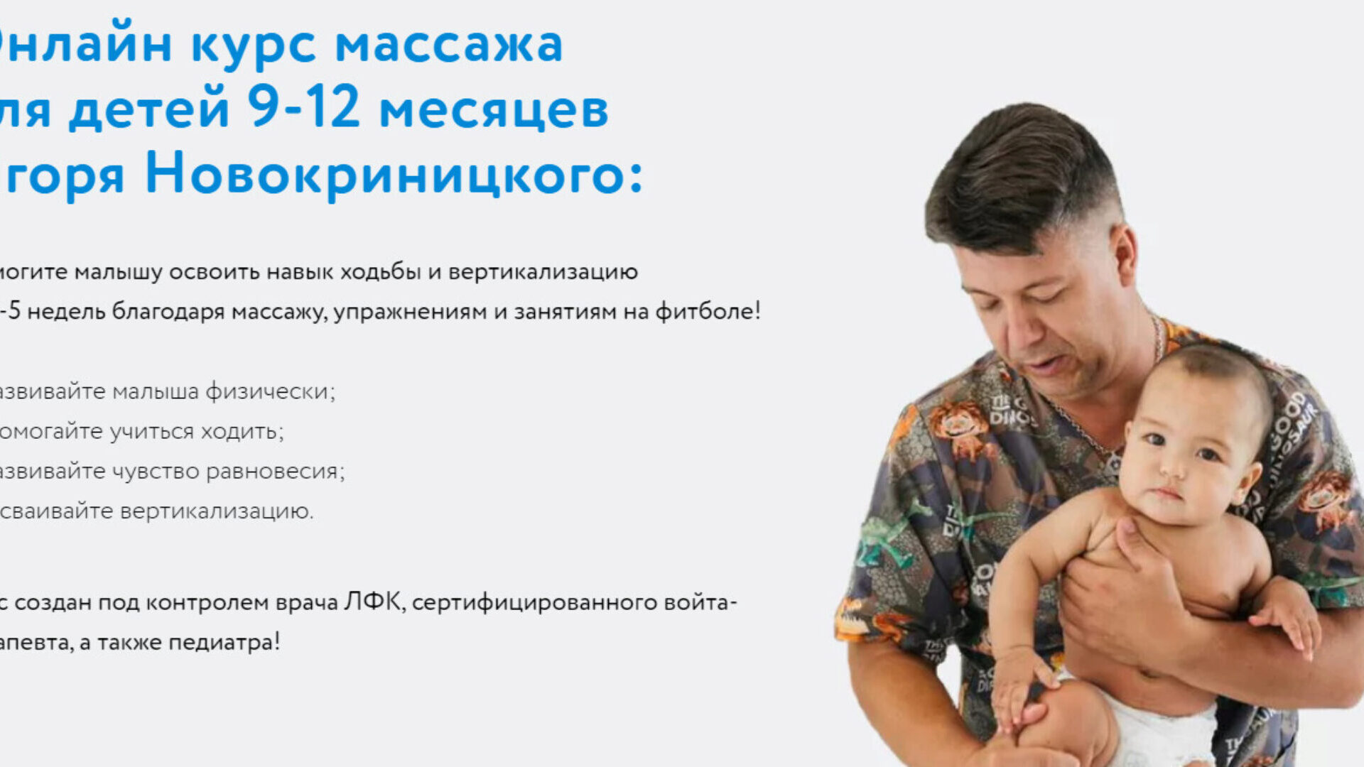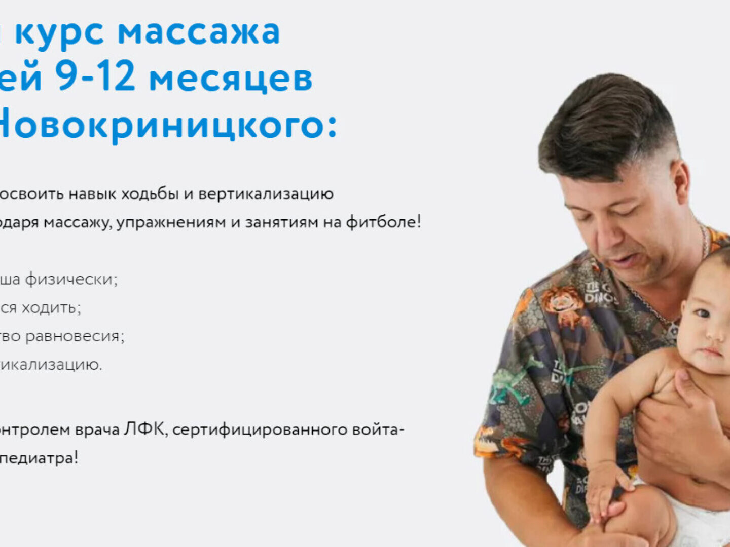 Массажист Игорь НОВОКРИНИЦКИЙ: Адепт ползания и раннего физического развития 0+. Автор видео-курса раннего физического развития «Малышовый фитнес» для детей с первого месяца Онлайн курс 3-6 месяцев Игоря Новокриницкого: Подготовьте малыша к активному движению и ползанию за 3 недели благодаря