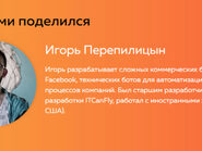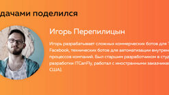 Игорь разрабатывает сложных коммерческих ботов для Telegram и Facebook, технических ботов для автоматизации внутренних процессов компаний. Был старшим разработчиком в студии веб-разработки ITCanFly, работал с иностранными заказчиками (Корея и США).