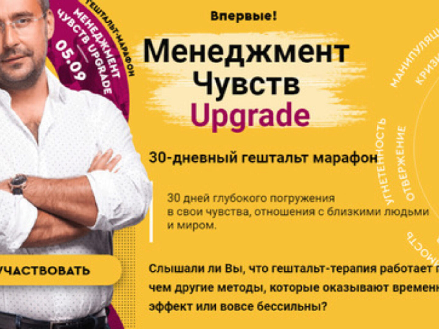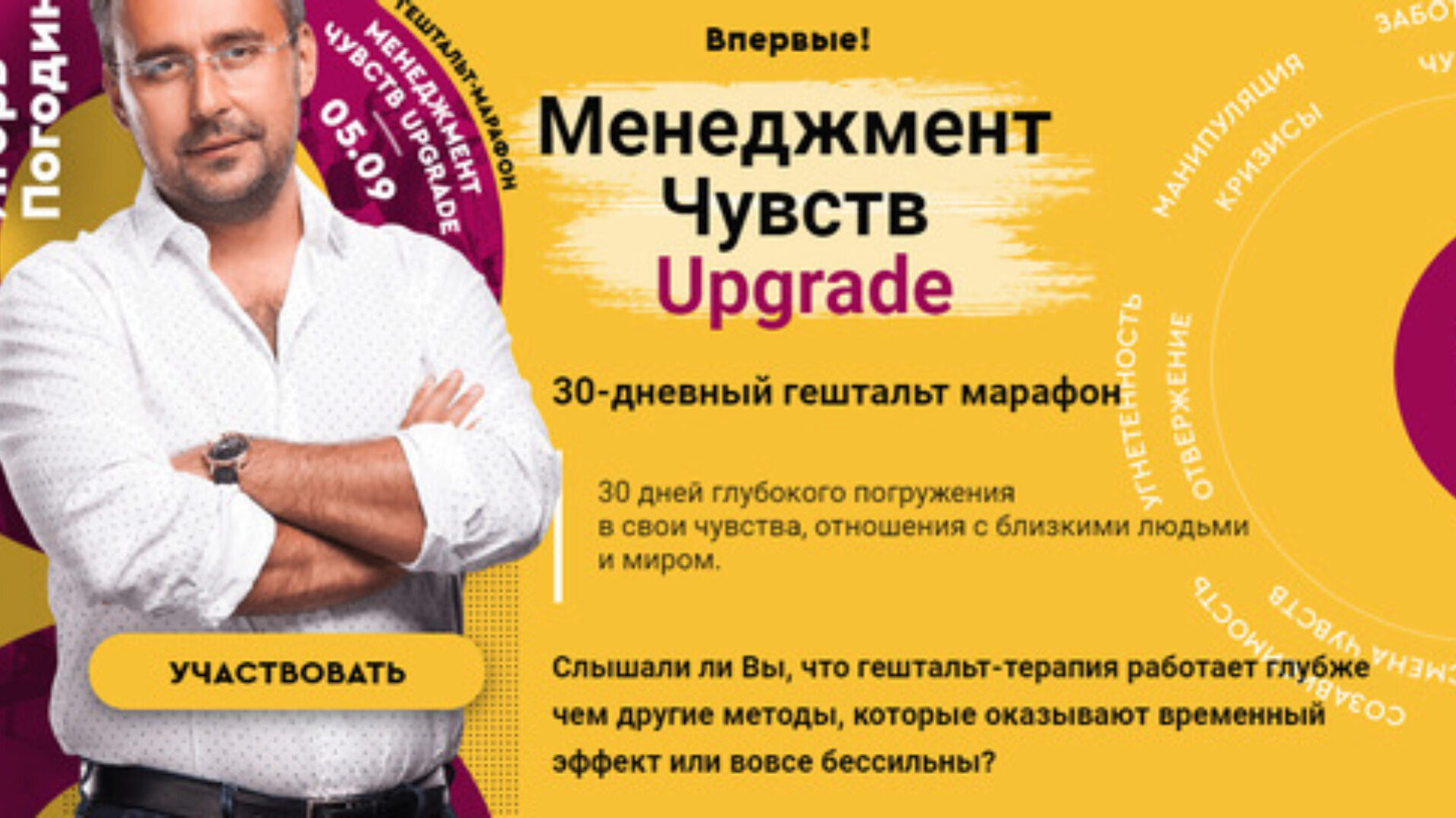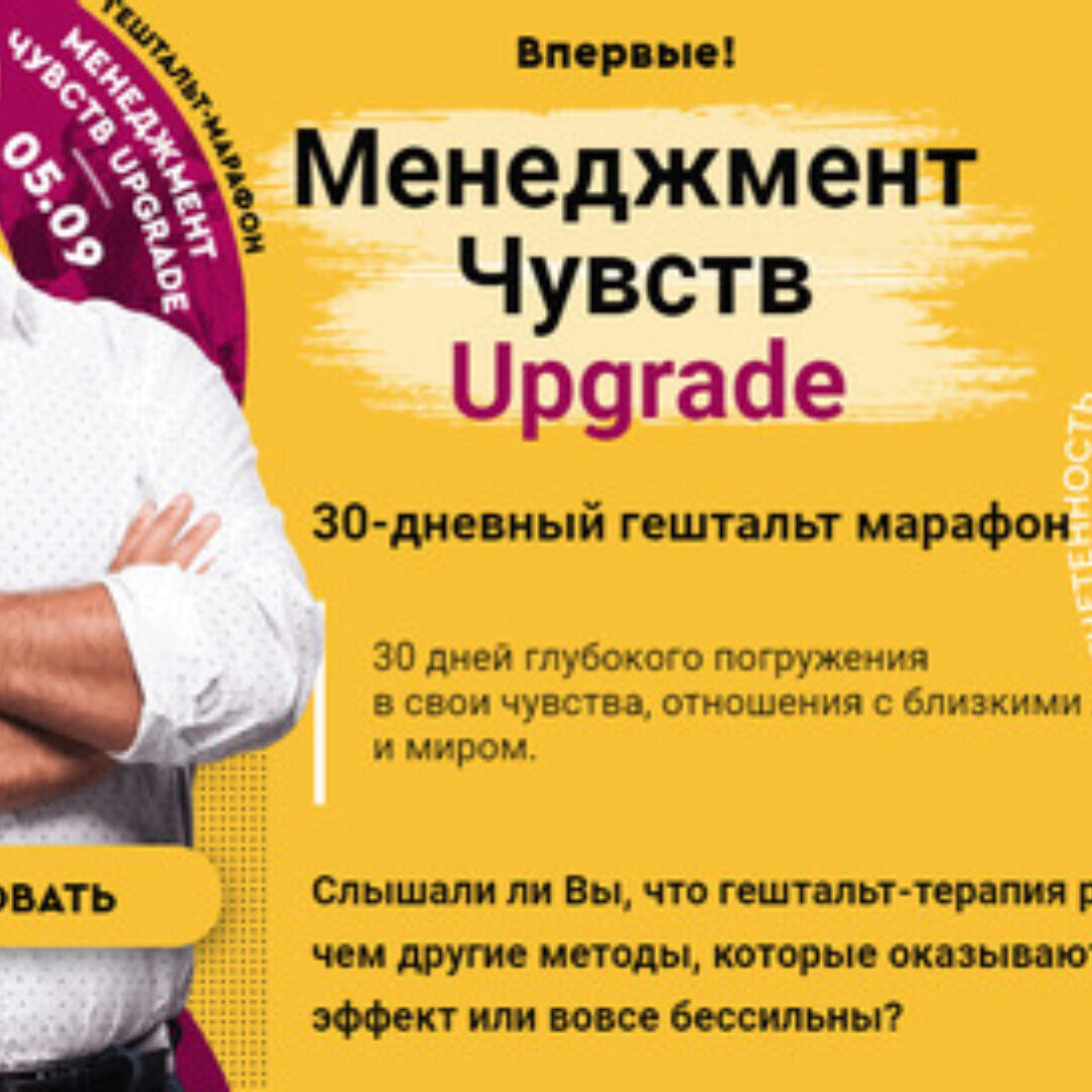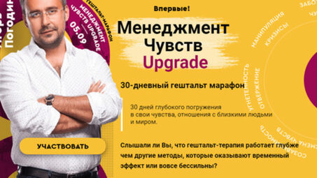 30-дневный курс тотальной перезагрузки своей жизни и отношений «Менеджмент Чувств UPGRADE» Игорь Погодин Старт 27 апреля 2020. Менеджмент Чувств Слышали ли Вы, что гештальт-терапия работает глубже чем другие методы, которые оказывают временный эффект или вовсе бессильны? 30 дней глубокого