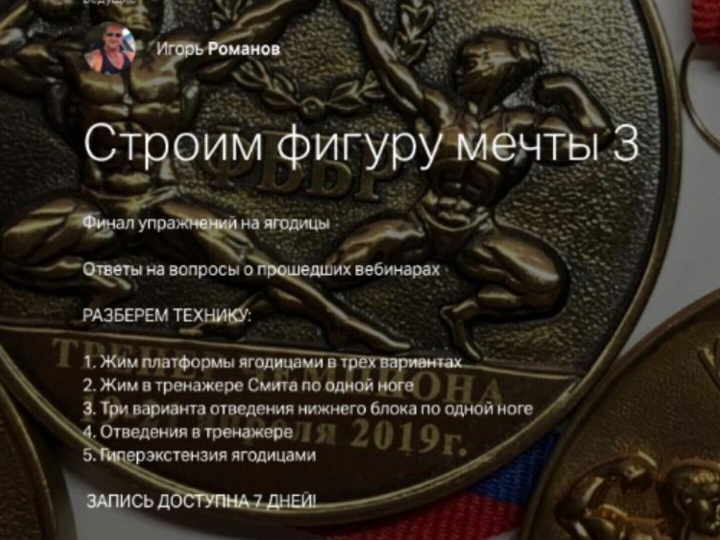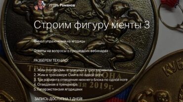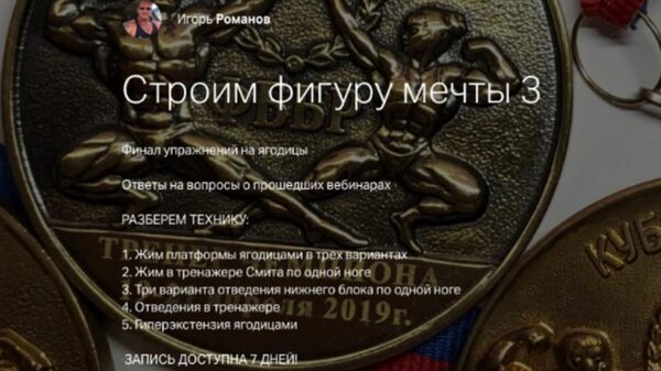 СТРОИМ ФИГУРУ МЕЧТЫ 14 ПРОГРАММА ТРЕНИРОВОК ПЯТЫЙ ТРЕНИРОВОЧНЫЙ КОМПЛЕКС от тренера чемпионок Игоря Романова Во избежании плато и лучшего прогресса, меняем тренировочный комплекс Продолжаем постигать тайны тренировочного процесса с Игорем Романовым Стоимость: 2000 ₽ Начало: 17 мар. 2020