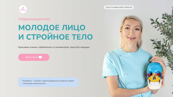 Глобальный Курс. Молодое лицо и стройное тело — это научный подход в омоложении лица и выстройки стройного тела Мы проанализировали мировые исследования по старению лица и Тела, выявили ключевые зоны на теле и ключевые точки на черепе, отвечающие: за процесс старения тела и шеи за старение и