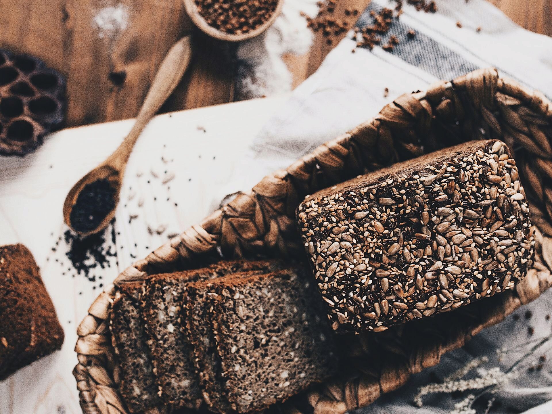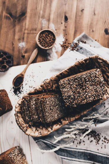 зерновой хлеб на рисовой закваске из муки зеленой гречки с изобилием разных семян;