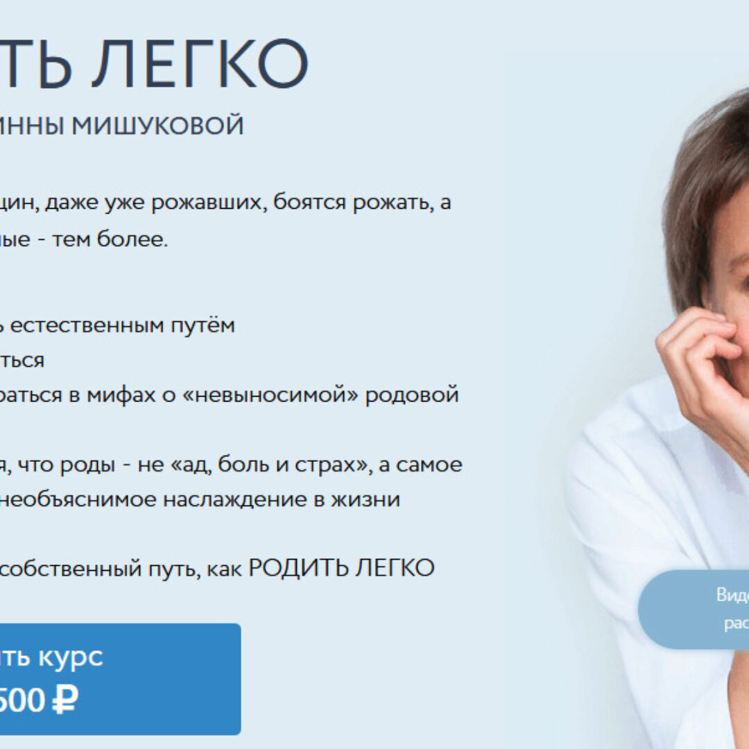 КАК РОДИТЬ ЗДОРОВОГО РЕБЕНКА Избавиться от страха боли и травм Узнать секреты благополучных родов Вы получите: 12 видео-уроков. Спойлер: Программа курса Урок 1 6 условий благополучных родов: когда, сколько и где рожать, чем плоха стимуляция родов Урок 2 Специальная физкультура для беременных -