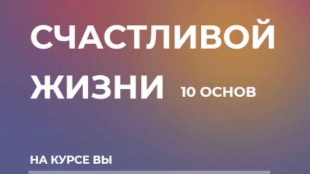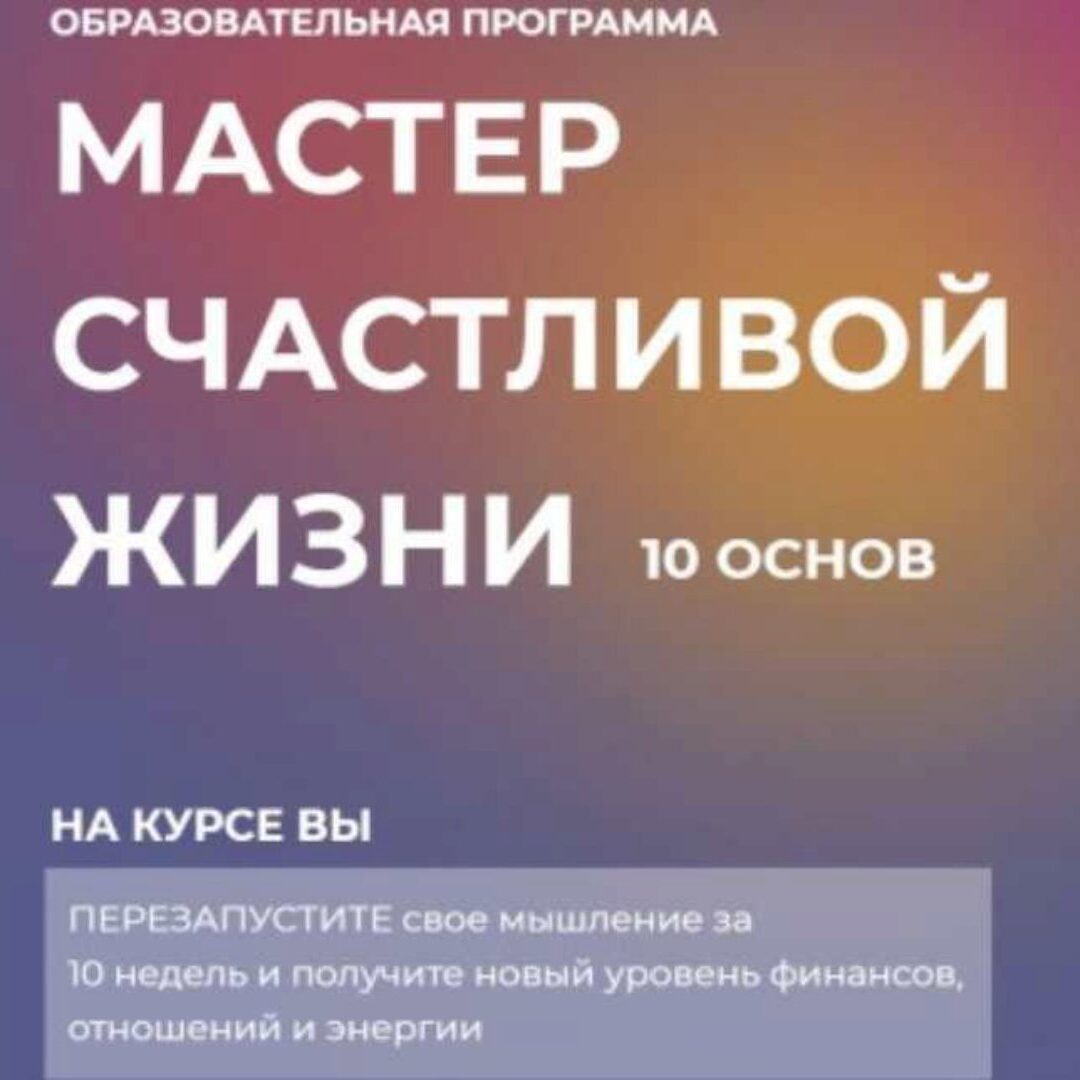 Мастер счастливой жизни. 10 основ (вводный урок, обучающие зум-встречи + 10 модулей) Вводный урок Обучающие зум-встречи 1 модуль Законы жизни 2 модуль Особо опасное чувство – Чувство вины 3 модуль Расстаёмся с негативным прошлым и обидами! 4 модуль Учимся любить себя правильно, навечно, навсегда!