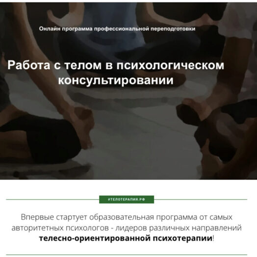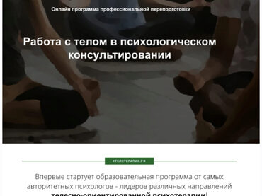 Программа повышения квалификации от лидеров различных направлений телесно-ориентированной терапии. Продолжительность обучения — 8 месяцев Срок освоения — 250 часов Основная задача программы - дать слушателям целостное и системное представление о возможностях работы с телом в психологическом