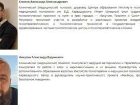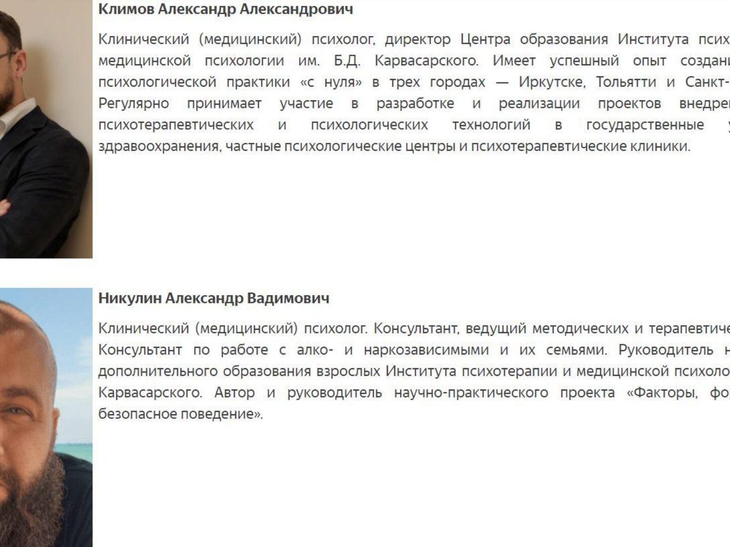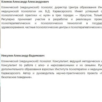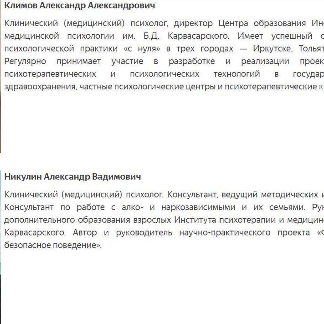 Клинический (медицинский) психолог. Консультант, ведущий методических и терапевтических групп. Консультант по работе с алко- и наркозависимыми и их семьями. Руководитель направления дополнительного образования взрослых Института психотерапии и медицинской психологии им. Б.Д. Карвасарского. Автор и руководитель научно-практического проекта «Факторы, формирующие безопасное поведение».