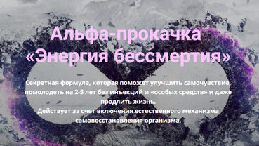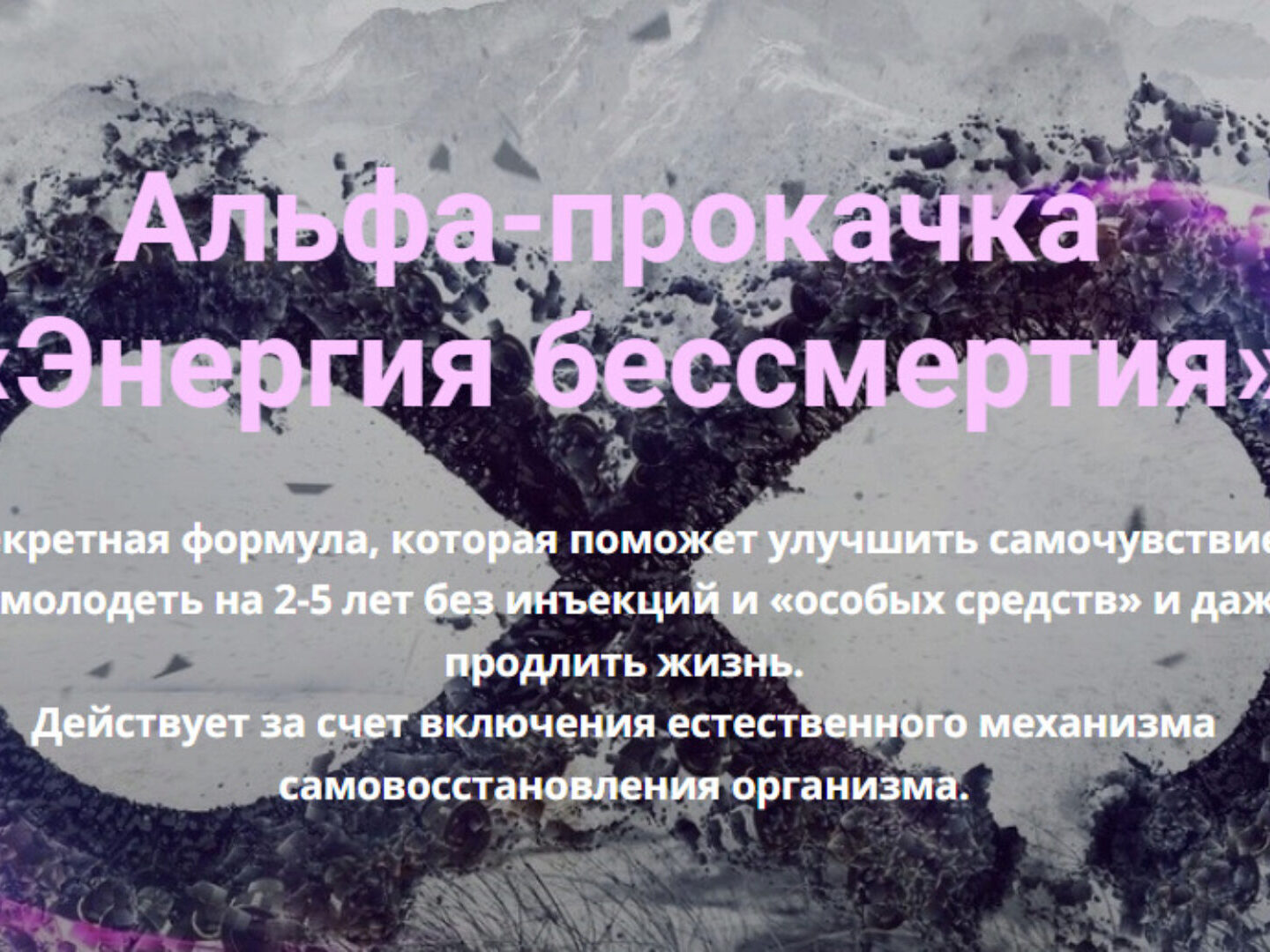 Авторская разработка слипера-гипнолога Ирины Белозерской - альфа-прокачка «Энергия Бессмертия» - создана таким образом, что каждый зритель безошибочно попадает в нужный альфа-диапазон и без усилий включает естественный механизм самовосстановления.